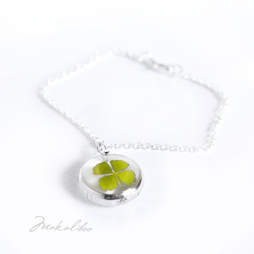 Cherms o średnicy 18 mm, kryje w sobie prawdziwą czterolistną koniczynkę zatopioną w żywicy. Baza w kolorze srebrnym.