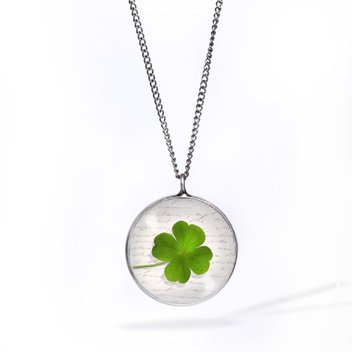 Wybierz sympatyczny naszyjnik, z koniczynką – odwiecznym symbolem szczęścia i pomyślności... Autorska grafika ukryta pod 20 mm szkiełkiem. baza naszyjnika w kolorze ciemnego srebra, łańcuszek 48 cm. Według tradycji każdy listek koniczyny coś symbolizuje. Pierwszy oznacza nadzieję, drugi wiarę, trzeci miłość, a czwarty szczęście. Projekt autorski, wszystkie prawa zastrzeżone..