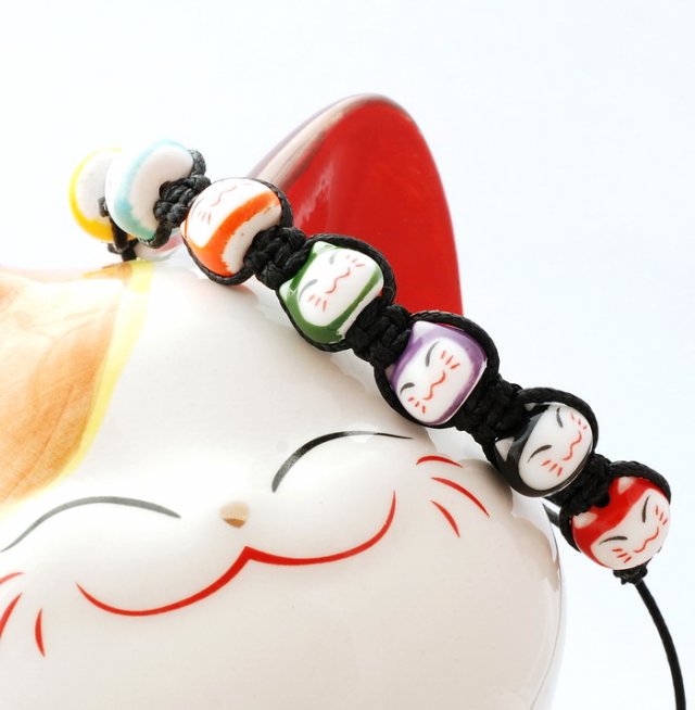 Zabawna i urocza bransoletka wykonana ze sznurka woskowanego z ośmioma małymi, chińskimi, ceramicznymi kotami szczęścia.