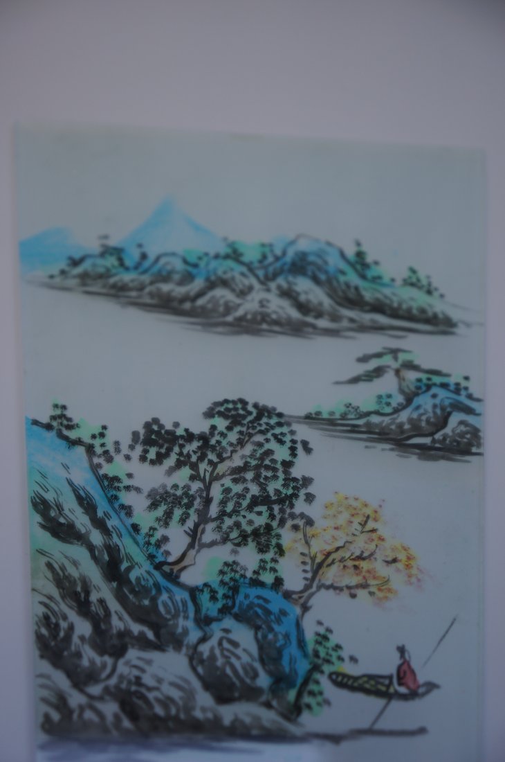 Dwa obrazki na szkle malowane - pejzaże. Bez ramek. Delikatna, pastelowa kolorystyka. Styl orientalny. Vintage. Stan bardzo dobry.