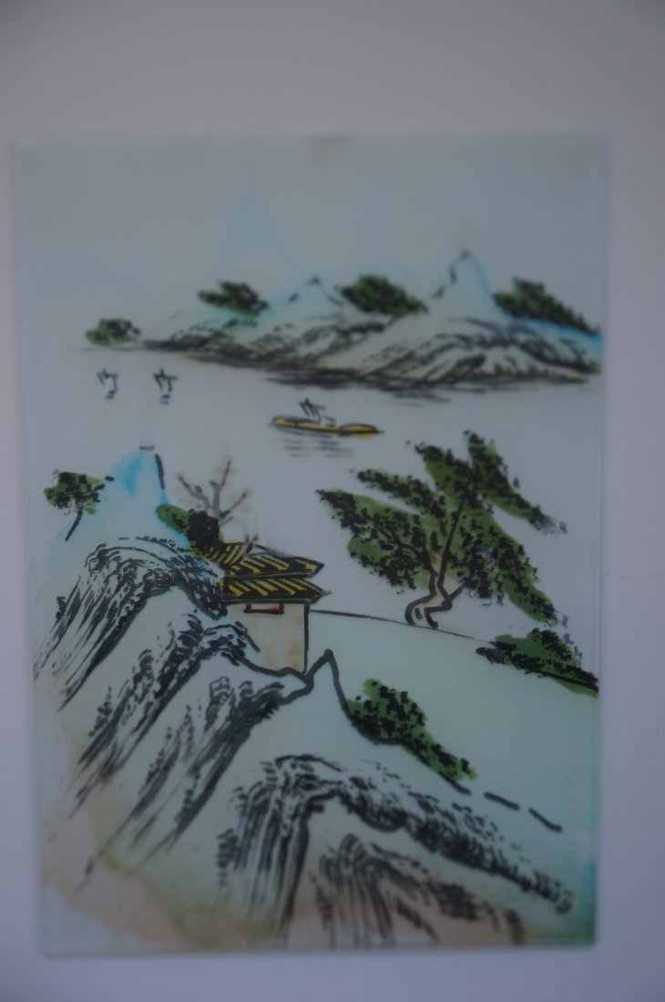 Dwa obrazki na szkle malowane - pejzaże. Bez ramek. Delikatna, pastelowa kolorystyka. Styl orientalny. Vintage. Stan bardzo dobry.