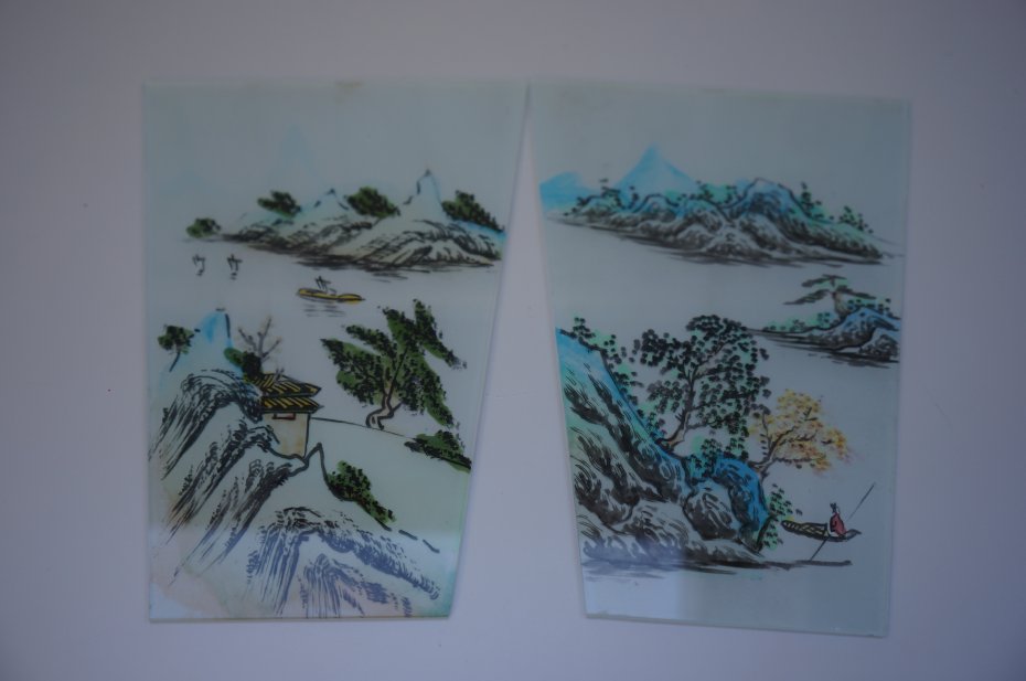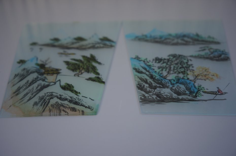 Dwa obrazki na szkle malowane - pejzaże. Bez ramek. Delikatna, pastelowa kolorystyka. Styl orientalny. Vintage. Stan bardzo dobry.