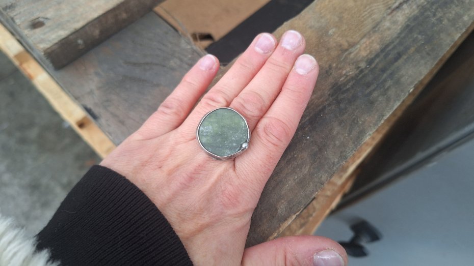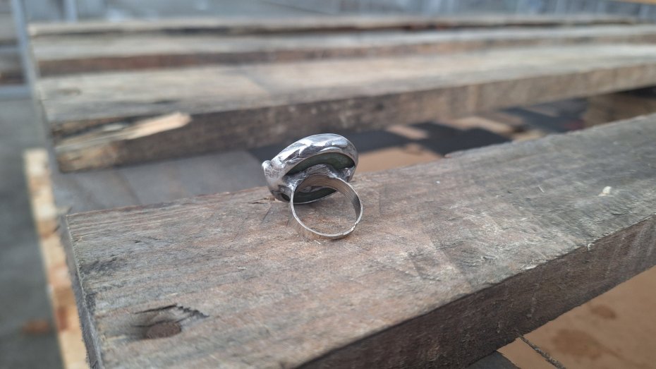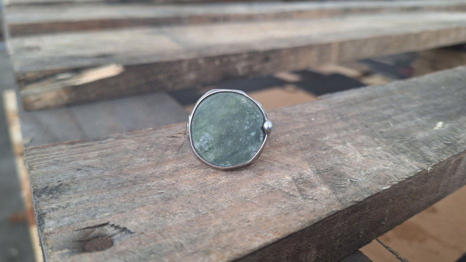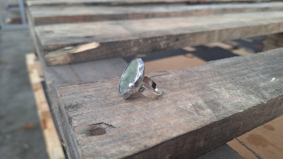 Pierścionek wykonany z miedzi, cyny i jadeitu. Wymiary ok. 2.5 na 2.5 cm. Regulowany. Nie jest ciężki.