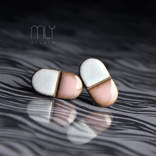 Ceramiczne podłużne kolczyki, ręcznie wykonane z delikatnej gliny kamionkowej, jednostronnie szkliwione mieszanką różowych i szarych szkliw z efektem plamek, tył matowy czekoladowobrązowy na antyalergicznych sztyftach w kolorze srebrnym.długość ok 1,8cm. Polecam . Termin realizacji zamówienia to 1-2 dni.