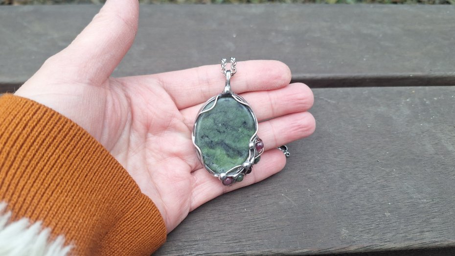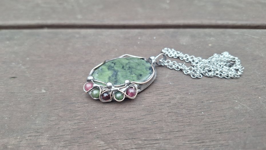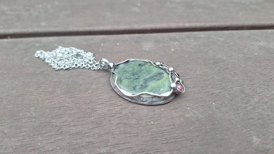 Wisiorek wykonany z miedzi, cyny, jadeitu i turmalinów. Wymiary ok. 4.5 na 3 cm. Zawieszony na łańcuszku o długości ok. 50 cm.
