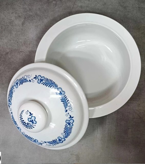 Średnica 17 cm, wysokość bez pokrywki 7,5 cm.