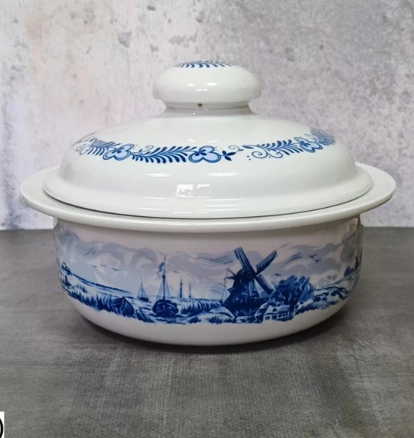 Ceramiczne naczynie do zapiekania z motywem wiatraka. Wierzch i boki szkliwione, dno bez szkliwa.
