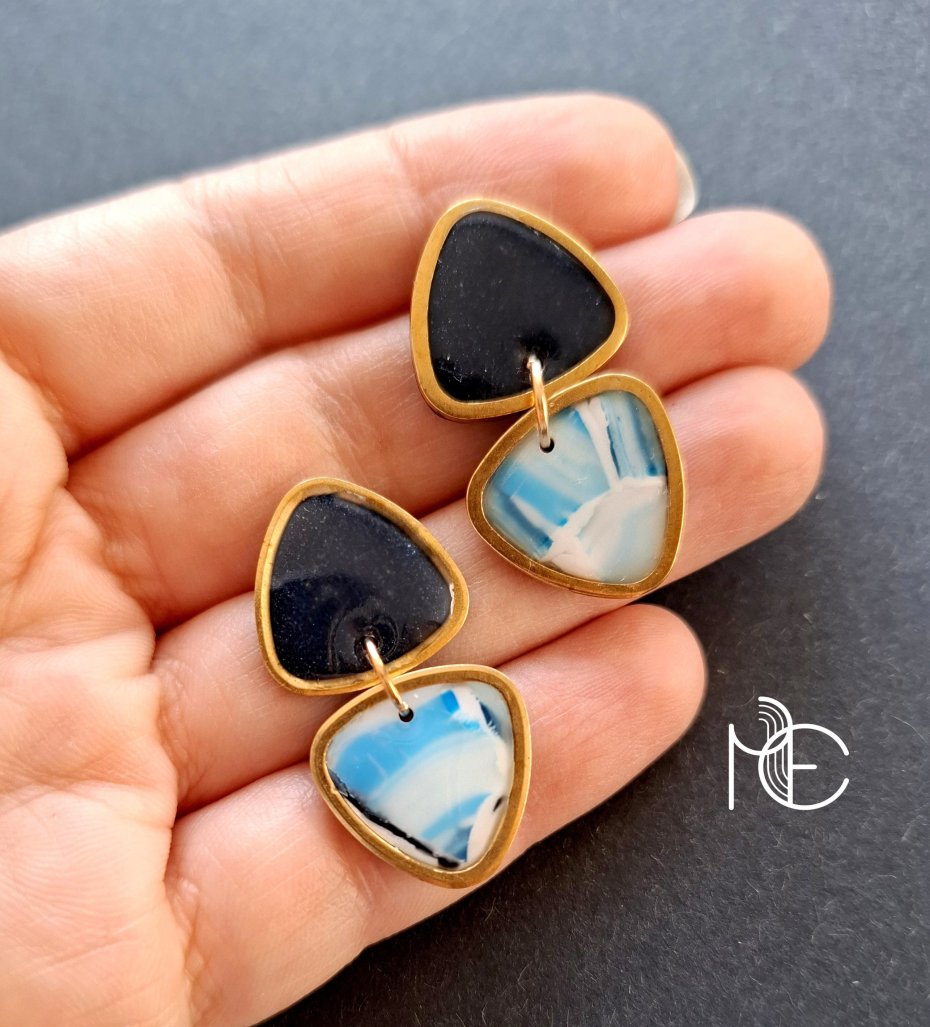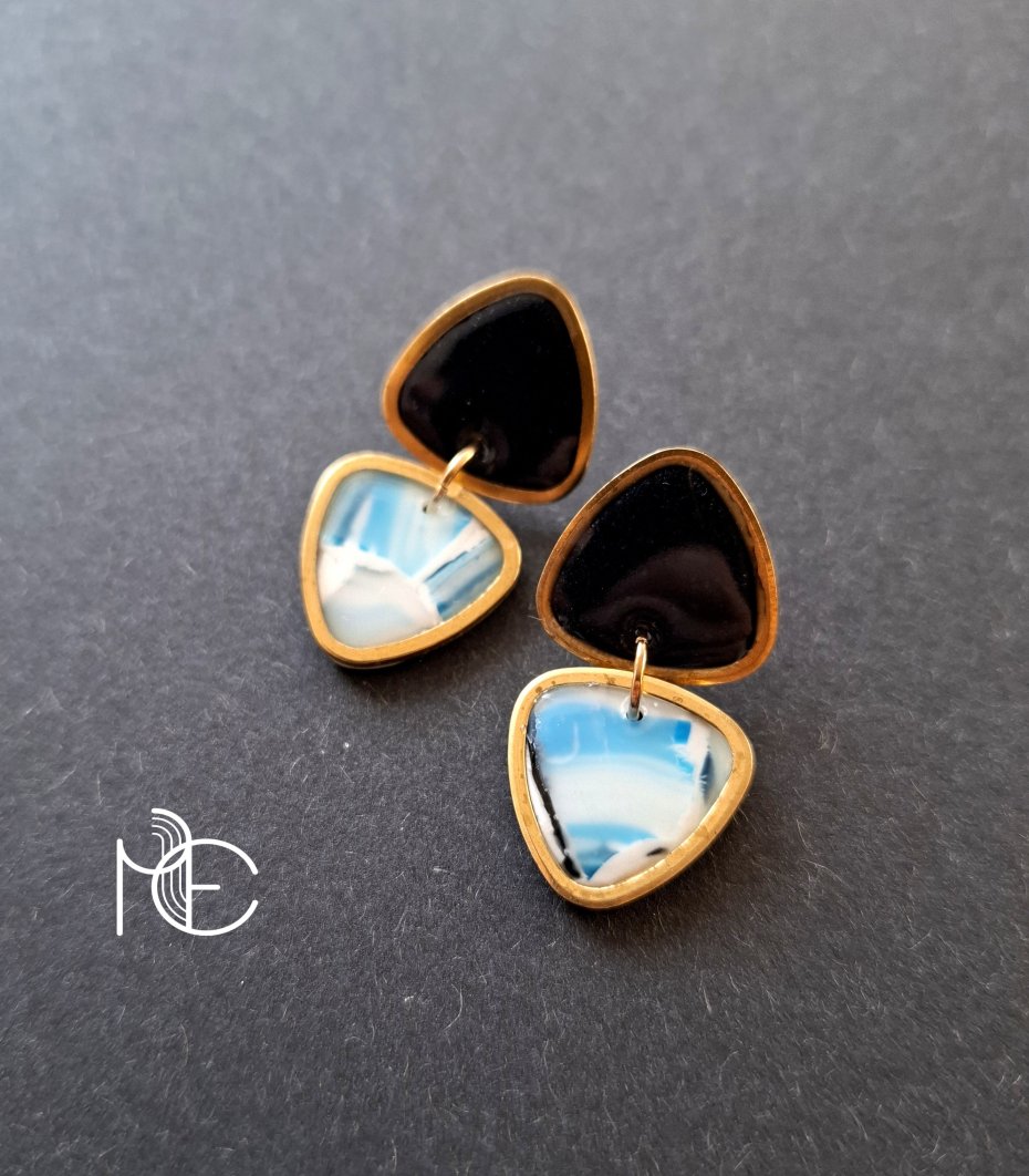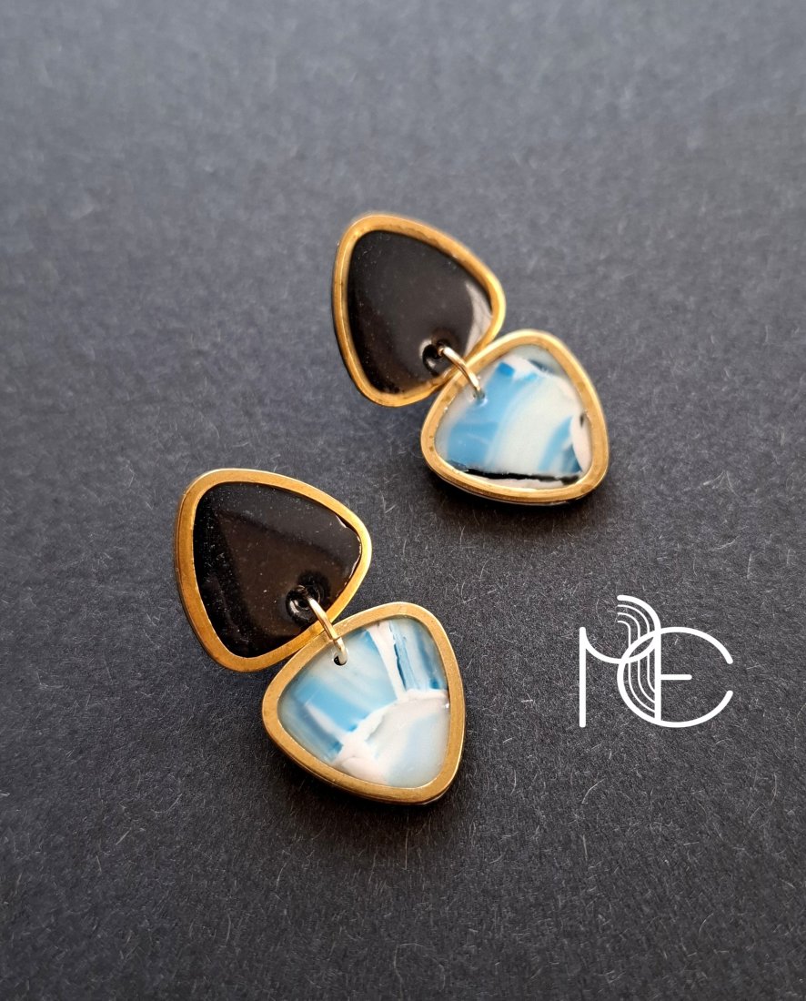 Ozdobne sztyfty wykonane z wysokiej jakości glinki polimerowej w połączeniu z ozdobnymi metalowymi elementami w złotym kolorze. Kolczyki jednostronne ze sztyftami pozłacanymi i nieuczulającymi z zapięciem na klasyczne baranki.
