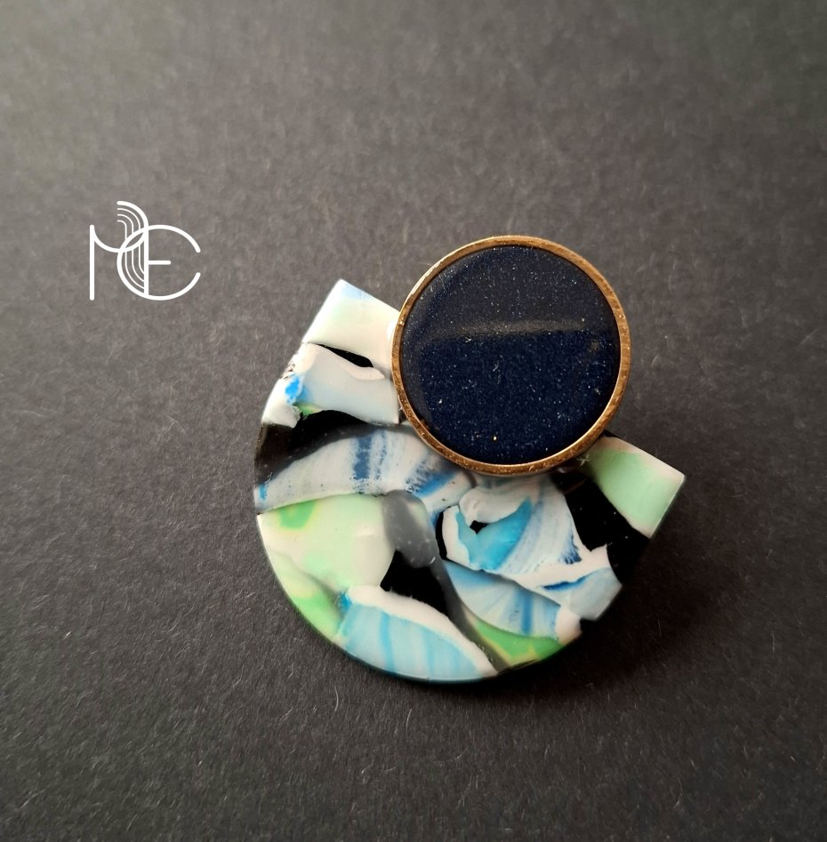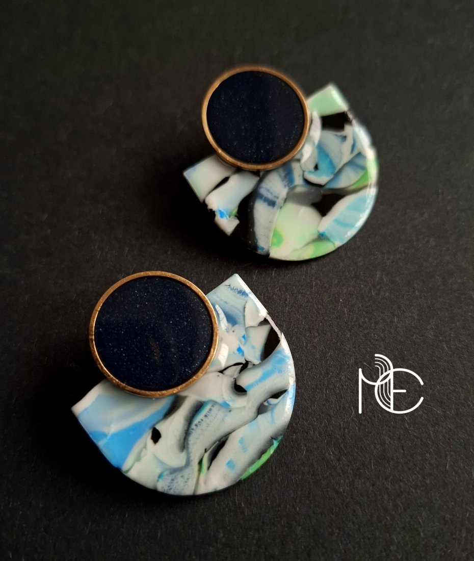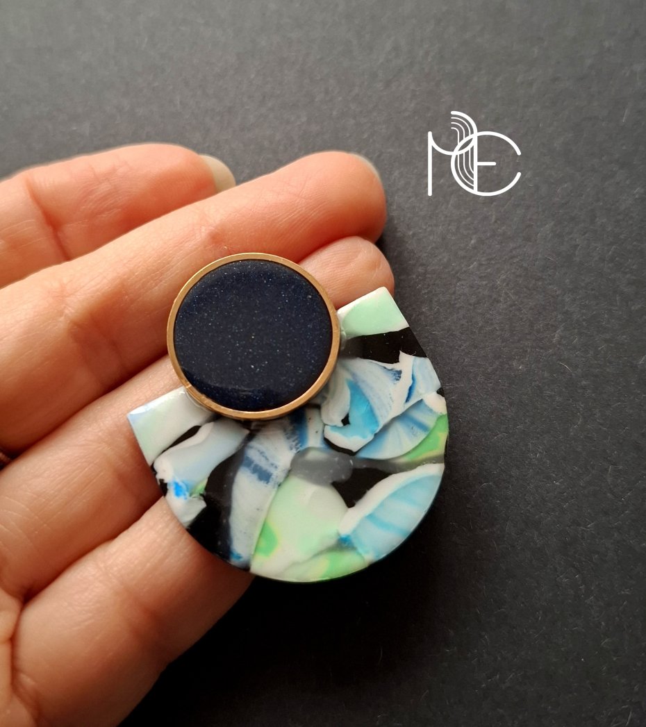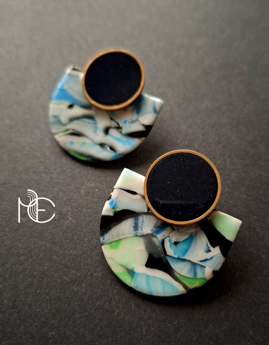 Kolczyki na sztyfty wykonane z wysokiej jakości glinki polimerowej z dodatkiem ozdobnych elementów metalowych. Jednostronne z pozłacanymi, nieuczulającymi sztyftami. Wymiary: długość wraz z zapięciem: 4 cm; szerokość max. 3,5 cm. Wykonane w jedynym egzemplarzu.