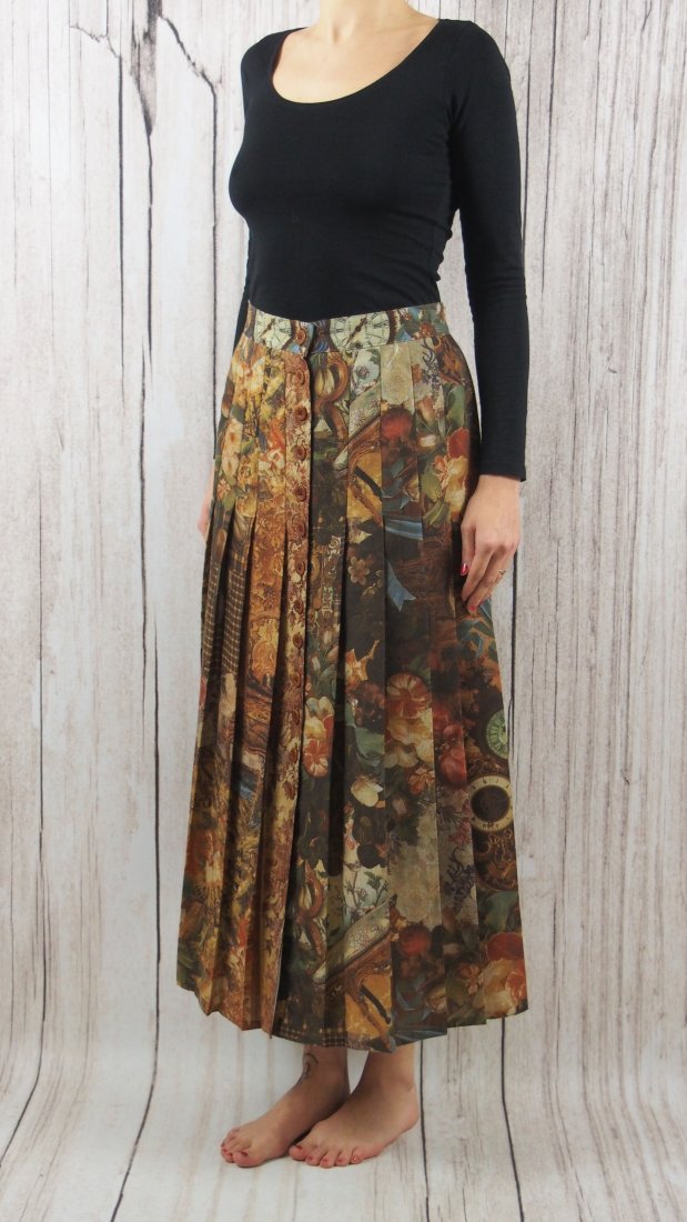 Przepiękna spódnica vintage. Całonadrukowa. Wzór nieziemski - zegary, wzory biblijne, księżne, kwiaty i wiele innych motywów. Pięknie skrojona. Zapinana na guziczki na przodzie. Marka bianca.