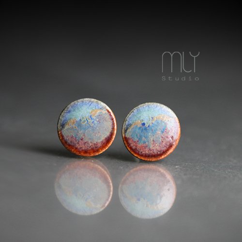 Ceramiczne okrągłe kolczyki w formie sztyftów, ręcznie wykonane z delikatnej gliny kamionkowej, jednostronnie szkliwione mieszanką czerwono brązowych i błękitnych szkliw z efektem plamek, na antyalergicznych sztyftach w kolorze srebrnym. Średnica ok. 11mm.