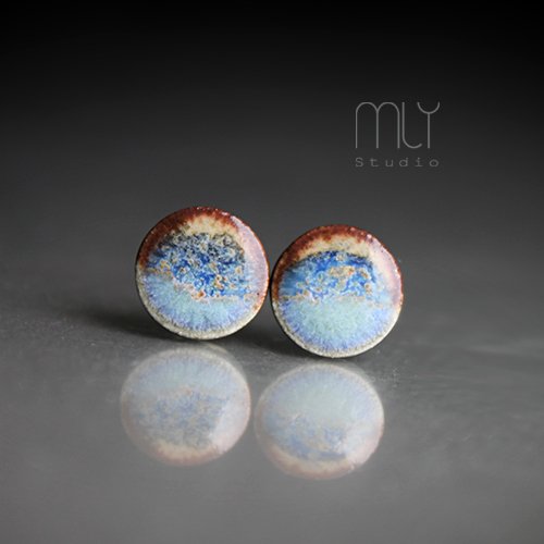 Ceramiczne okrągłe kolczyki w formie sztyftów, ręcznie wykonane z delikatnej gliny kamionkowej, jednostronnie szkliwione mieszanką brązowych i błękitnych szkliw z efektem plamek, na antyalergicznych sztyftach w kolorze srebrnym. Średnica ok. 9mm.