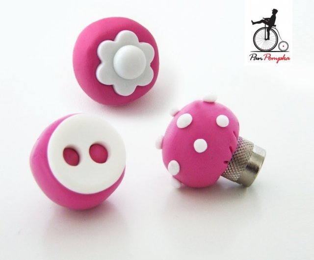 Nakrętki na wentyle od Pana Pompki wspaniałą ozdoba dla Twojego roweru. Dostępny również inne akcesoria do kompletu: pokrowiec na siodełko, koszyk wraz z materiałowym wkładem, osłona tylnego koła, chwyty kierownicy - zobacz całą kolekcję.Do wyboru wentyle typu samochodowego lub zwykłe rowerowe. 2 sztuki w komplecie. Ręcznie wykonane w Polsce. Idealne na prezent dla ukochanej osoby!