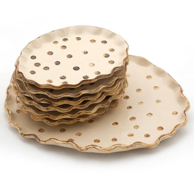 Jest to ręcznie wykonany komplet ceramiczny, patera i sześć talerzyków deserowych.