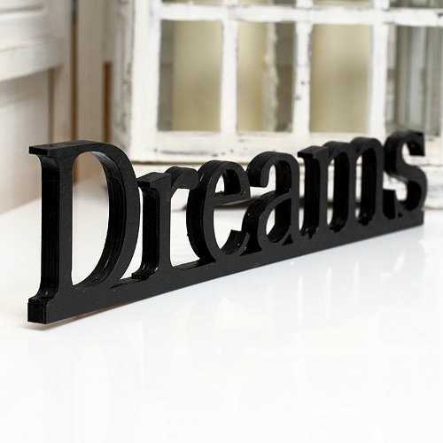 Drewniane połączone litery tworzące napis Dreams pomalowane na czarno, wkomponowują się każde wnętrze, dodając mu uroku. Patrząc na nie przypominamy sobie, że warto mieć marzenia.