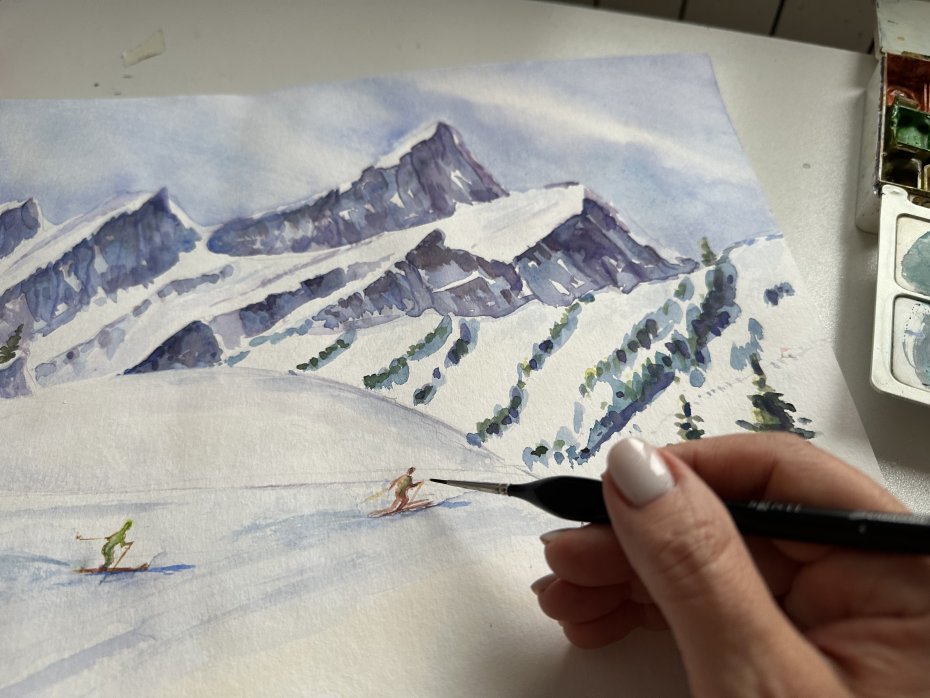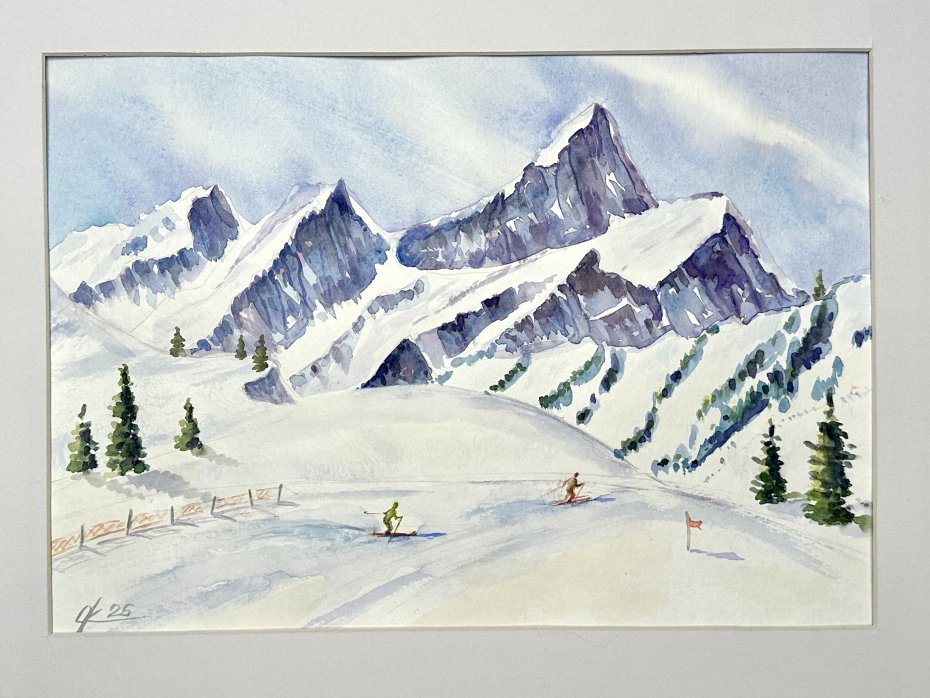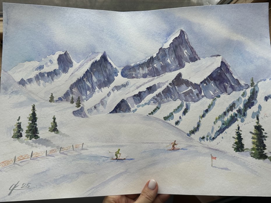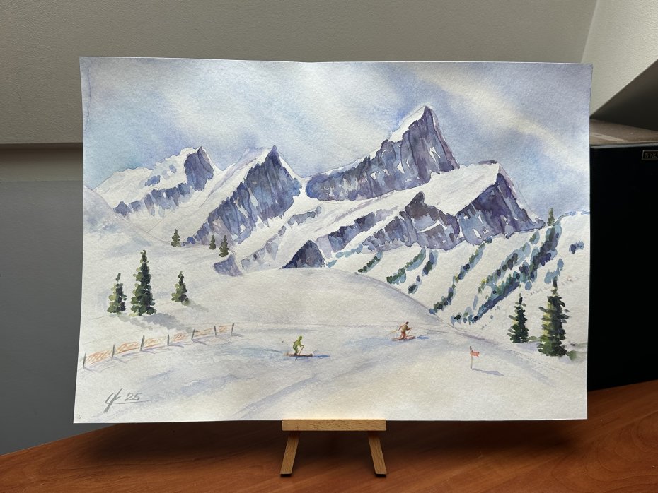 Narciarstwo alpejskie. Original Akwarela A4ręcznie malowana.