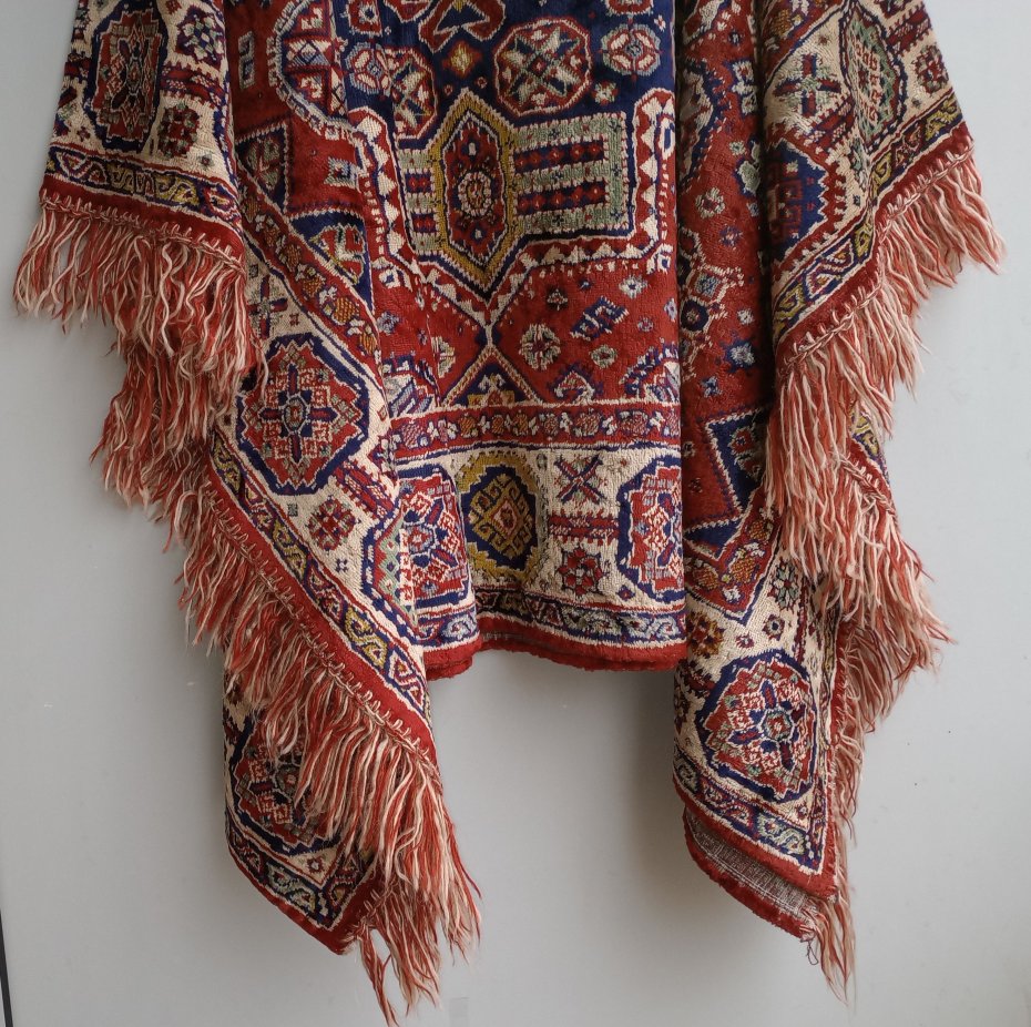 Orientalna, mięsista narzuta (lub inny element wystroju mieszkania) true vintage (sprzed 40-50 lat). Dwukolorowe frędzle z dwóch stron. Tkanina to coś w rodzaju bawełnianego aksamitu. Rzeczywista kolorystyka jest stonowana, lekko przygaszona, najbliższa temu, co widać na pierwszym zdjęciu.