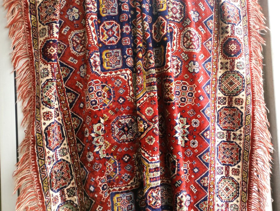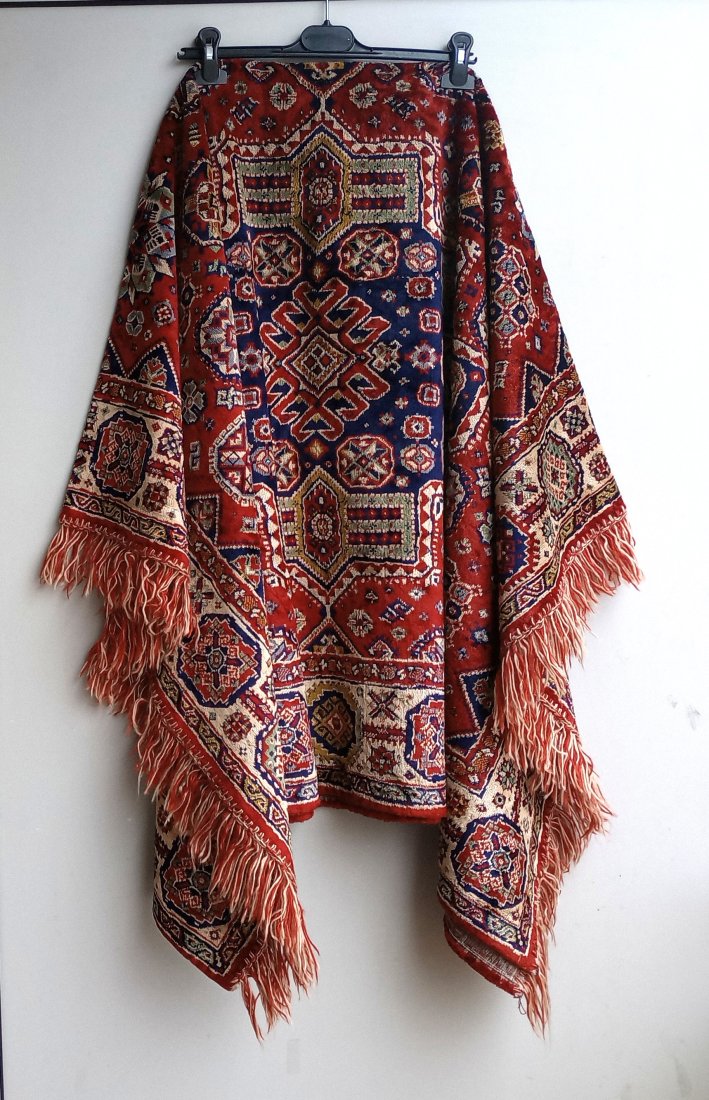 Orientalna, mięsista narzuta (lub inny element wystroju mieszkania) true vintage (sprzed 40-50 lat). Dwukolorowe frędzle z dwóch stron. Tkanina to coś w rodzaju bawełnianego aksamitu. Rzeczywista kolorystyka jest stonowana, lekko przygaszona, najbliższa temu, co widać na pierwszym zdjęciu.