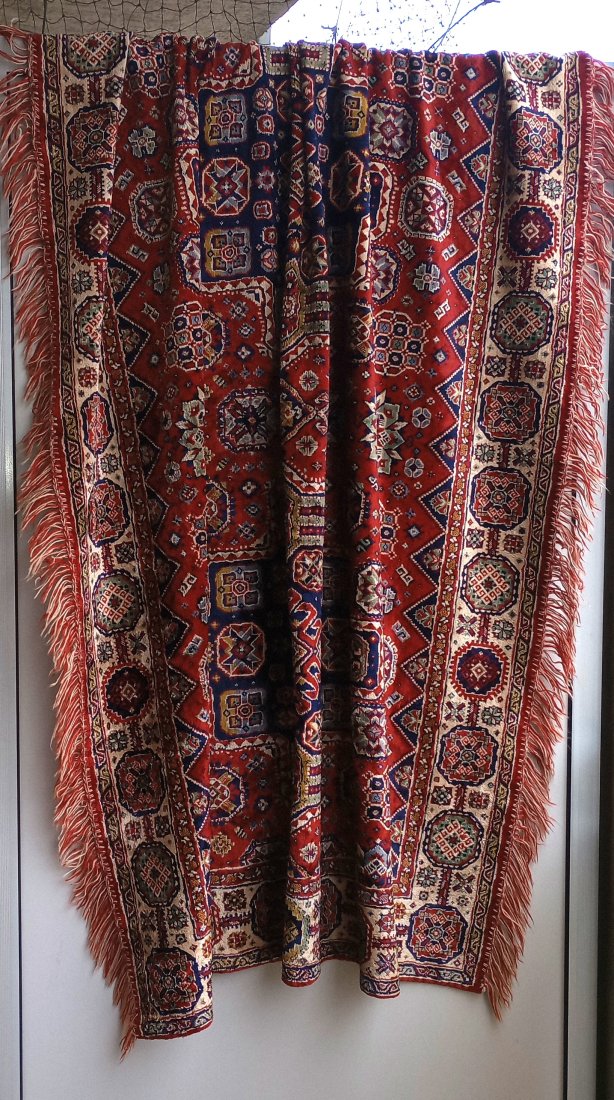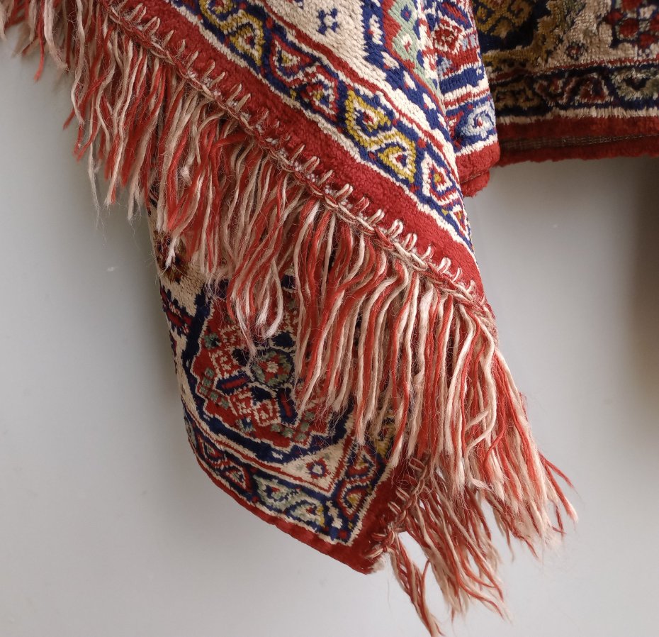 Orientalna, mięsista narzuta (lub inny element wystroju mieszkania) true vintage (sprzed 40-50 lat). Dwukolorowe frędzle z dwóch stron. Tkanina to coś w rodzaju bawełnianego aksamitu. Rzeczywista kolorystyka jest stonowana, lekko przygaszona, najbliższa temu, co widać na pierwszym zdjęciu.