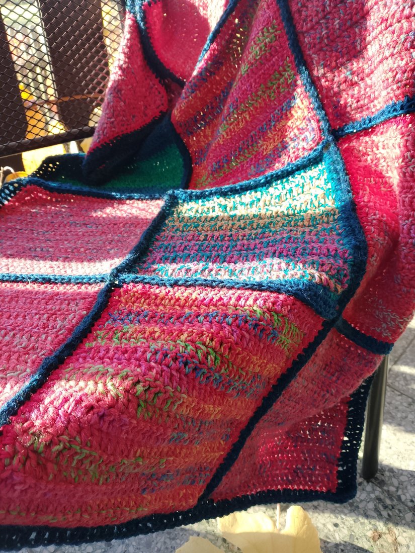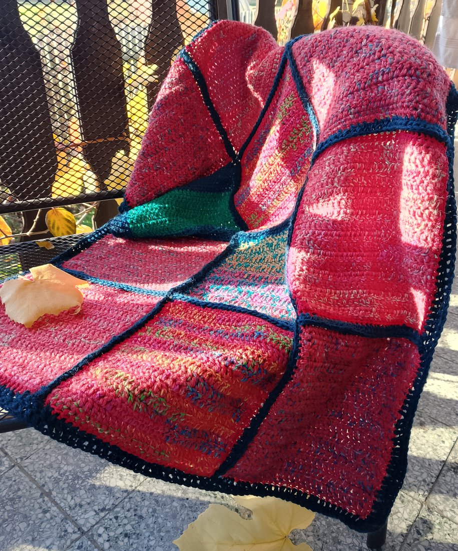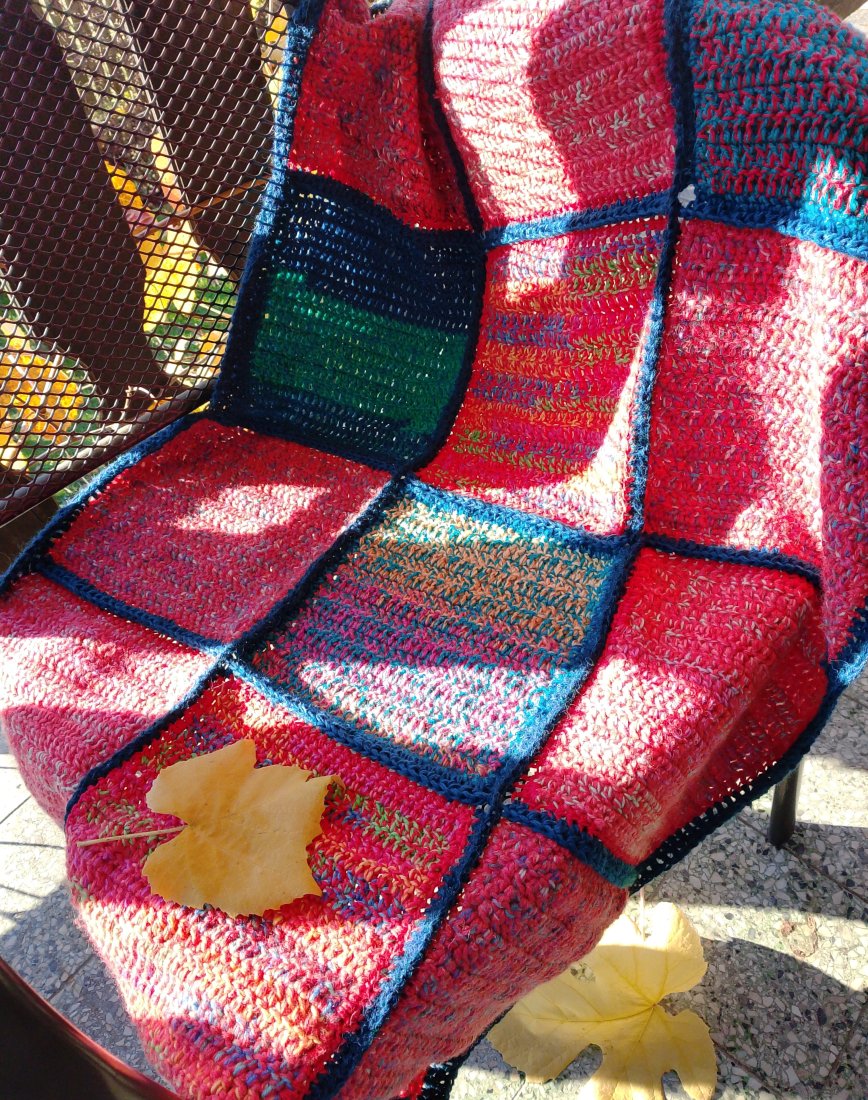 Kolorowa narzuta w całości wykonana ręcznie. Wymiary 75 cm x 95 cm.
