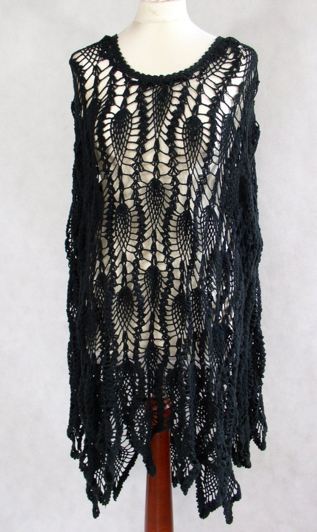 Czarna narzutka zrobiona szydełkiem.Brak metek.Wzór mocno ażurowy.Długi rękaw.Nici bawełna z akrylem nie jest sztywna.Stan ogólny dobry+.Długość przodu 94 cm.tyłu 109 cm.pod pachami 156 cm.