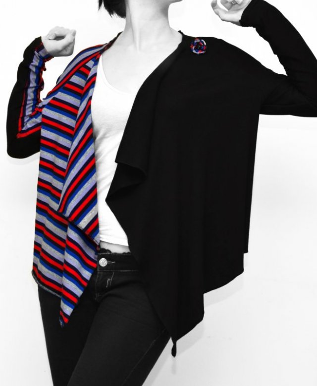 Narzutka wykonana została z cienkiej dzianiny dresowej w kolorze czarnym oraz w kolorowe paski. Wygodny, luźny krój. Można ją nosić swobodnie opuszczoną w dół lub z paskiem (w sprzedaży narzutka bez paska). Asymetryczna, tył dłuższy od przodu. Dodatkowo z narzutką broszka wykonana z tego samego materiału. Rozmiar M