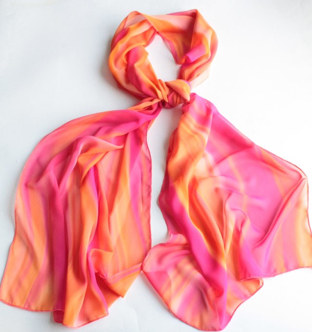 Zwiewny, półtransparentny szal w głębokich kolorach. Materiał to prawdopodobnie wiskoza.