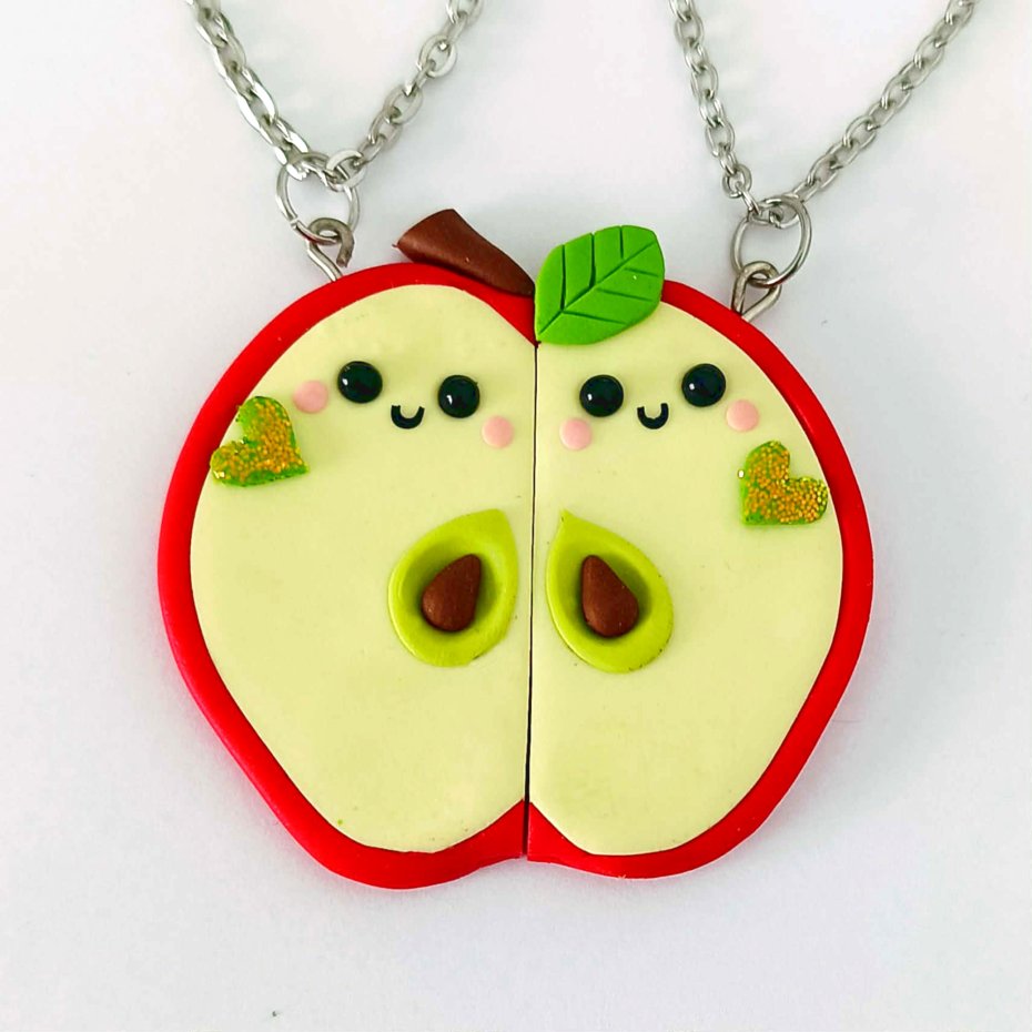 Ręcznie wykonany naszyjnik z masy polimerowej w kształcie jabłka podzielonego na dwie połówki. Każda z nich ma uroczą buzię, a razem tworzą jedną całość – słodko i z przymrużeniem oka