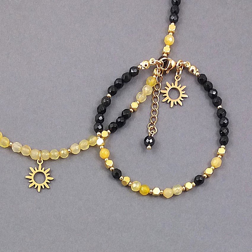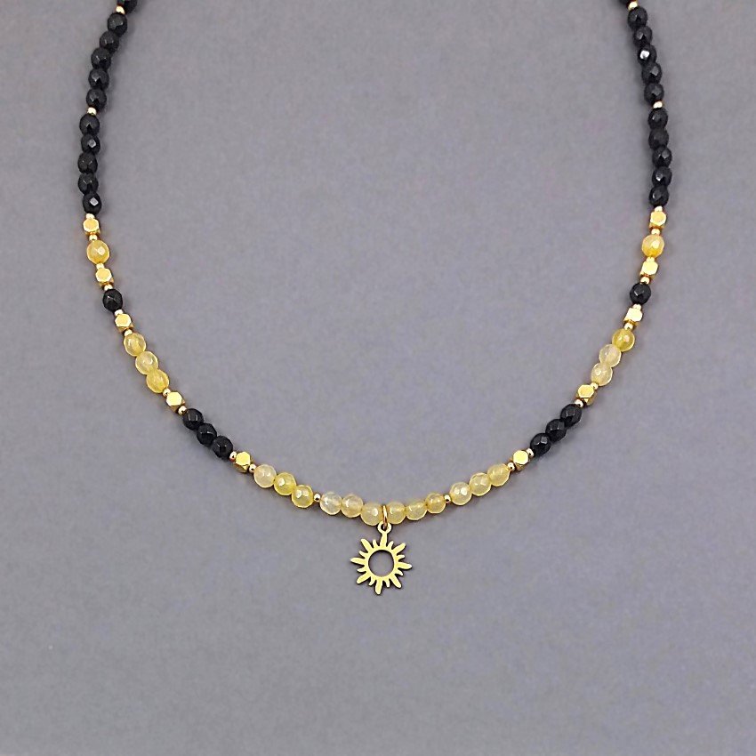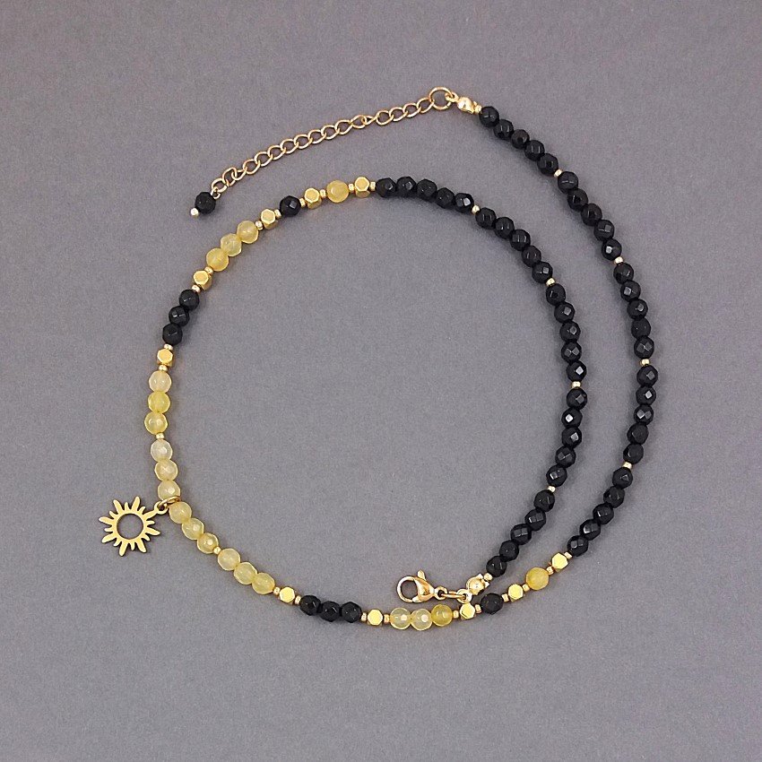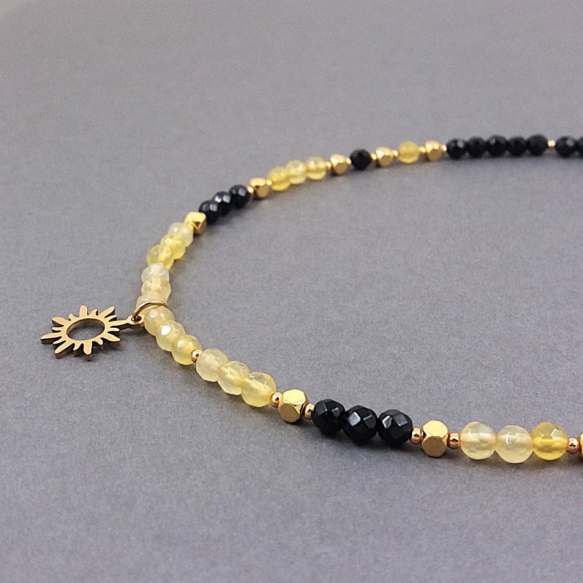 Krótki naszyjnik z naturalnych kamieni: fasetowanych kulek żółtego i czarnego agatu, i ściętych kostek złotego hematytu. Kamienie mają średnicę 4 mm.