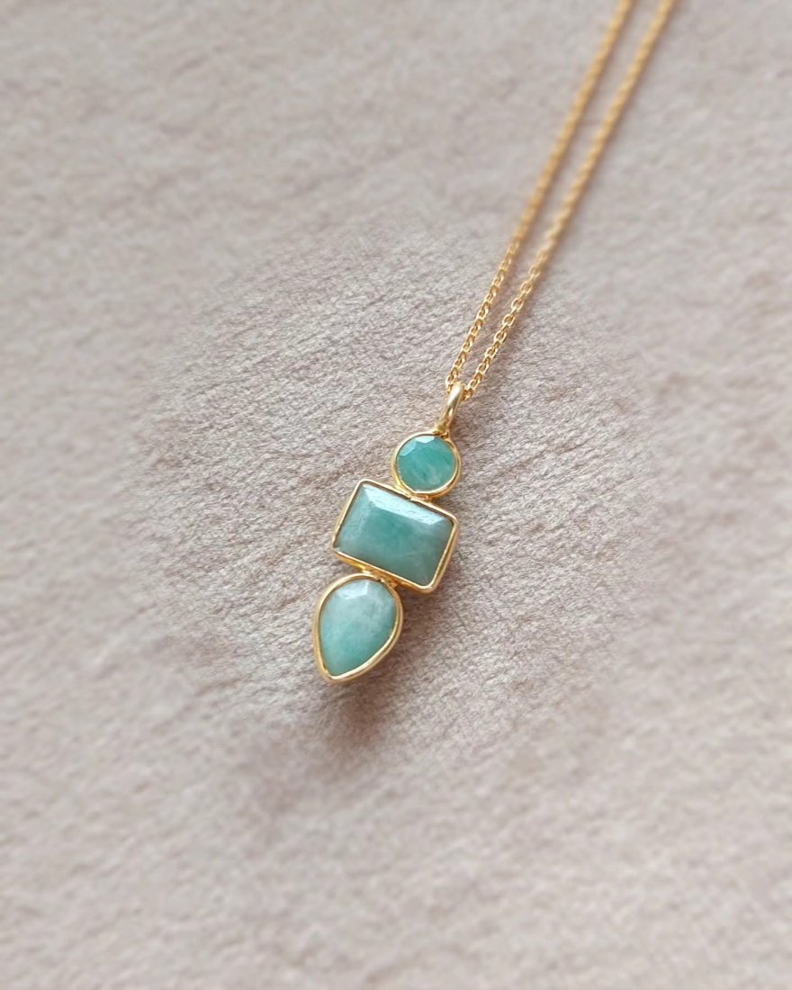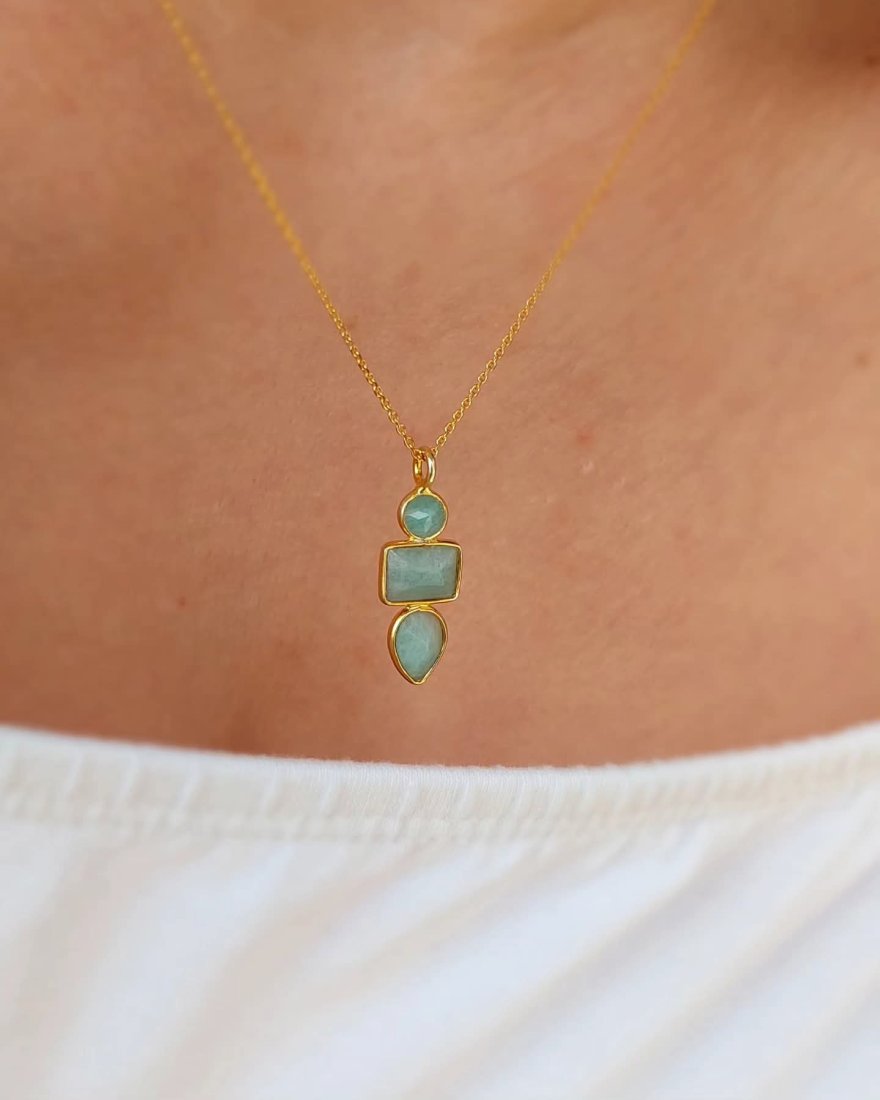 Amazonity użyte w zawieszce są w kolorze pastelowej zieleni, ale minerał ten może występować także w barwach intensywnego morza, żółto-zielonej, a nawet niebieskiej.