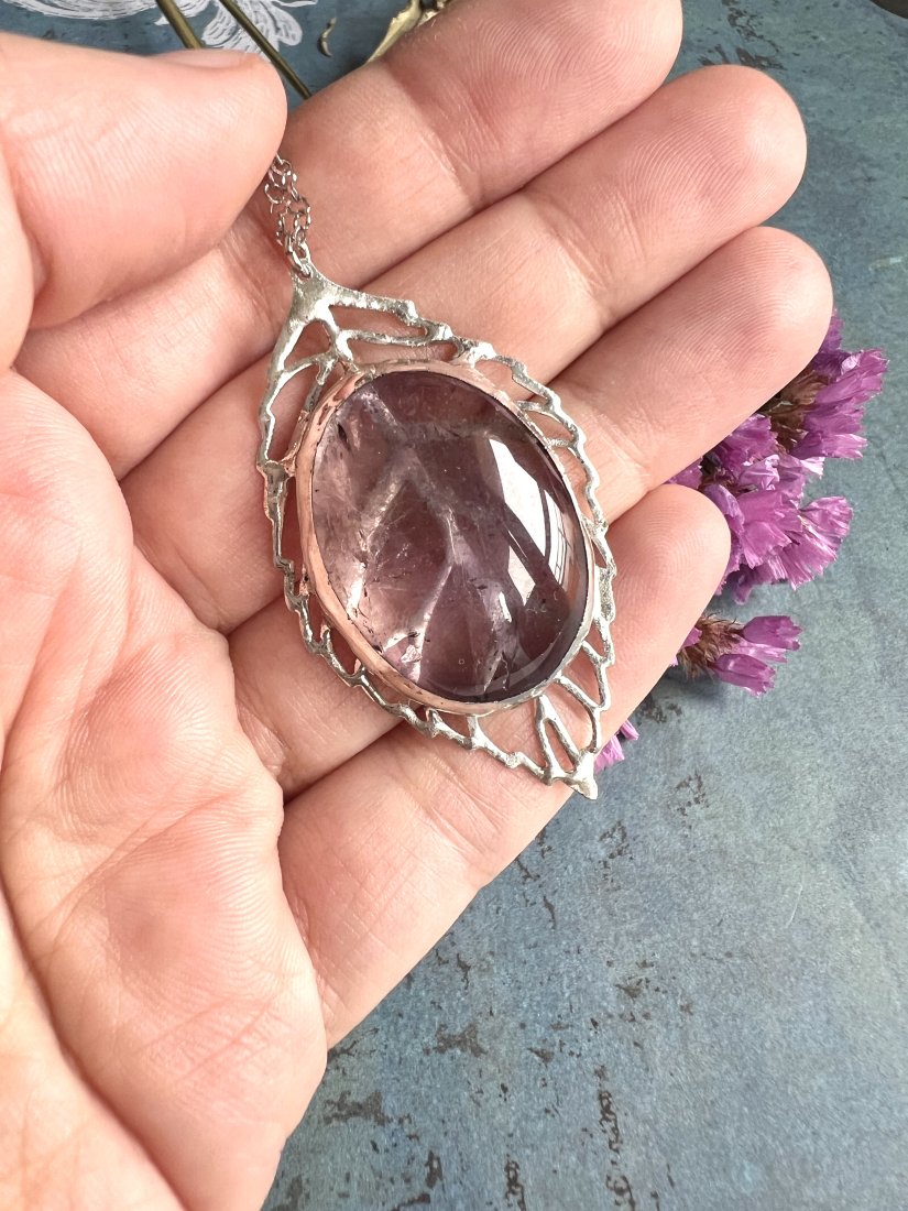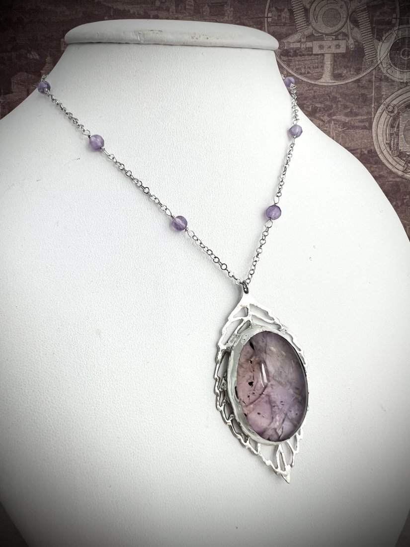 Delikatny naszyjnik w stylu fantasy. Został wykonany ręcznie techniką Tiffany'ego. Głównym elementem amuletu jest kamień naturalny, ametyst w pięknym pastelowym odcieniu i idealnej przejrzystości. Minerał oprawiony jest metalową bazą, miedzią i cyną bezołowiową. Zawieszony na łańcuszku ze stali chirurgicznej z maleńkimi ametystami. Długość naszyjnika to ok 52 cm.