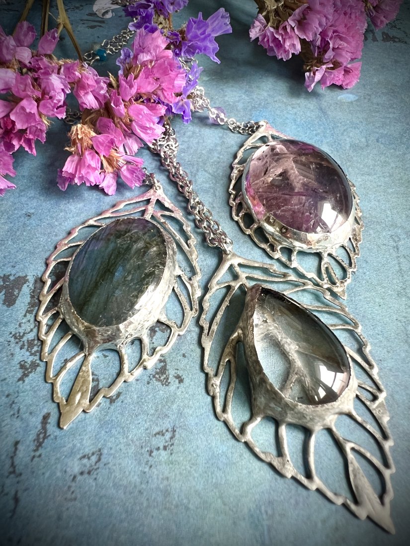 Tagi: #ametyst, #biżuteria fantasy, #kamienie naturalne, #naszyjnik liść