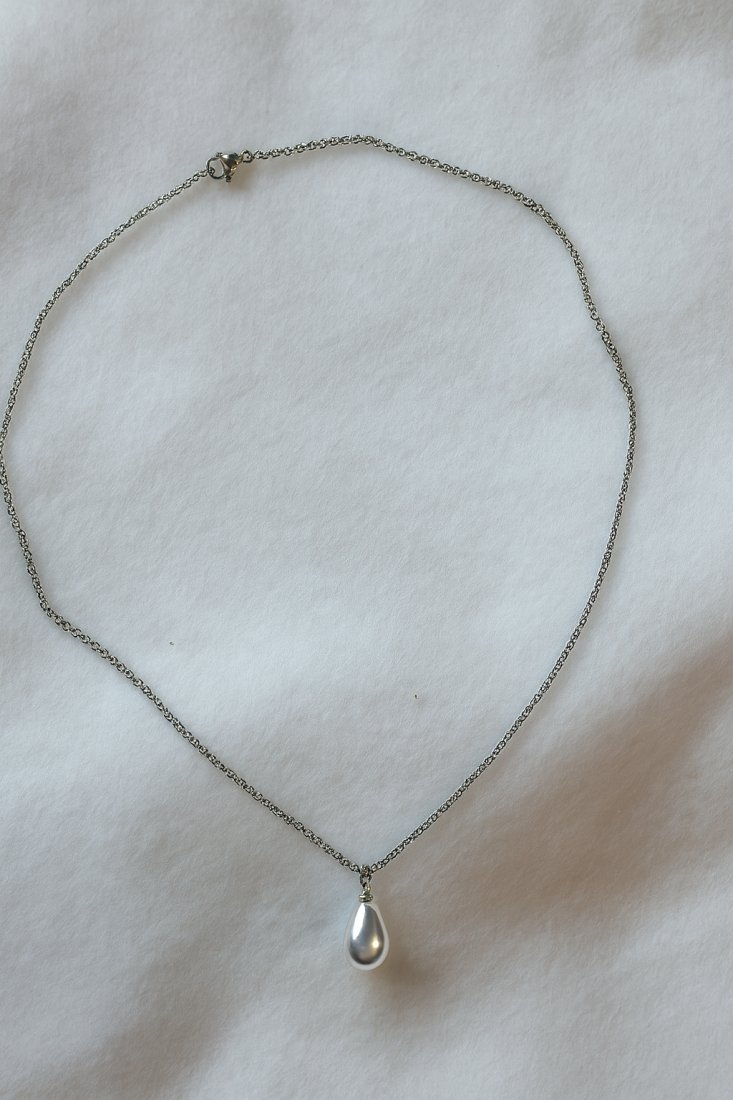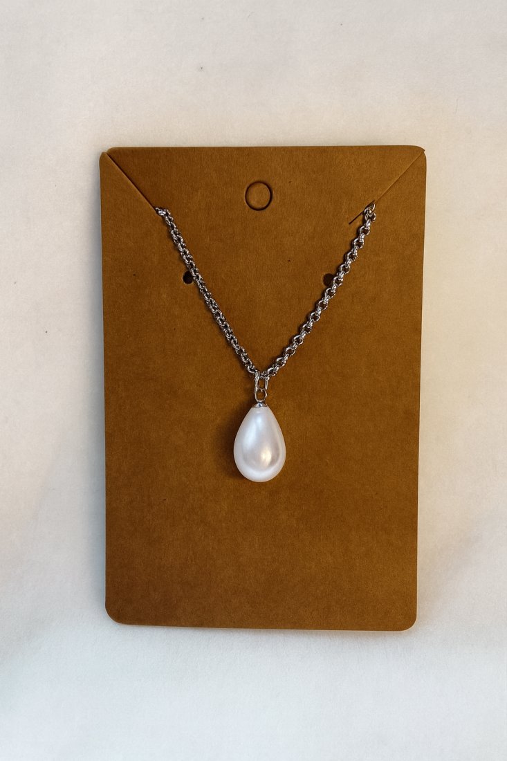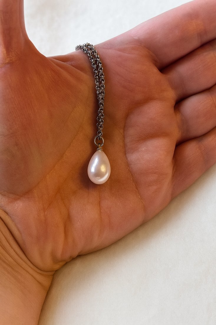 Na stalowym łańcuszku zawieszona jest kropla o perłowym wykończeniu, wykonana z wysokiej jakości żywicy ABS, pięknie odbijająca światło niczym oceaniczna fala. To propozycja dla osób ceniących elegancję w codziennej formie — subtelną, a jednocześnie przyciągającą spojrzenia.