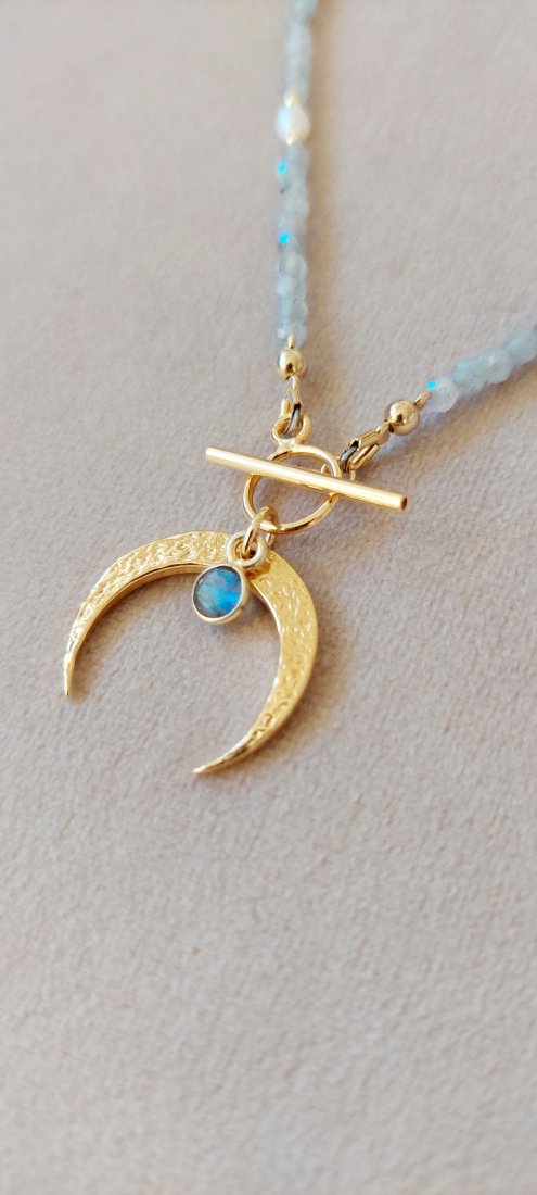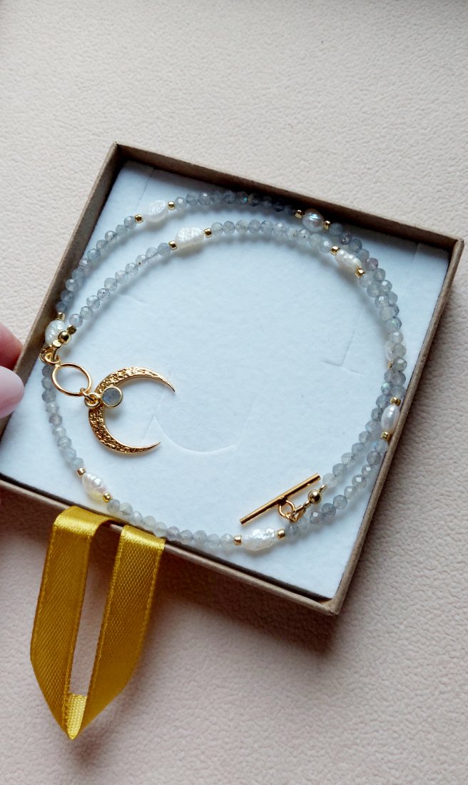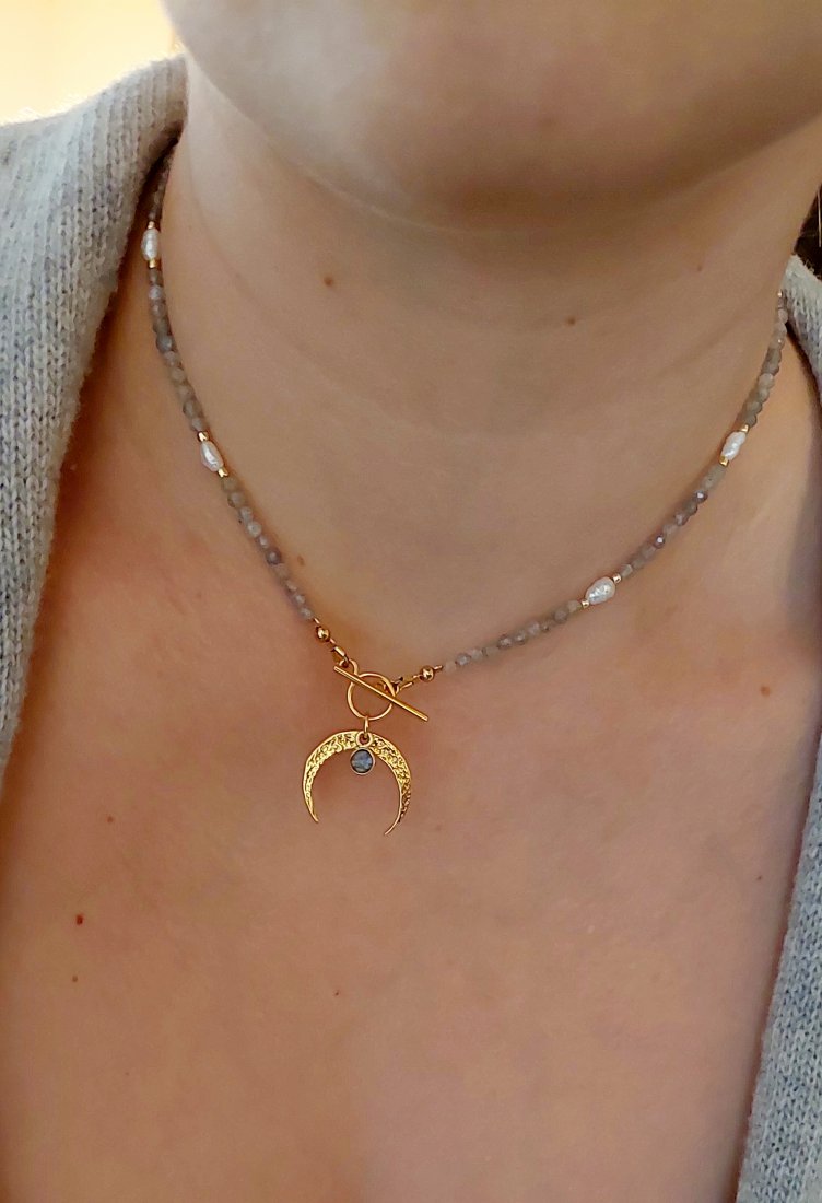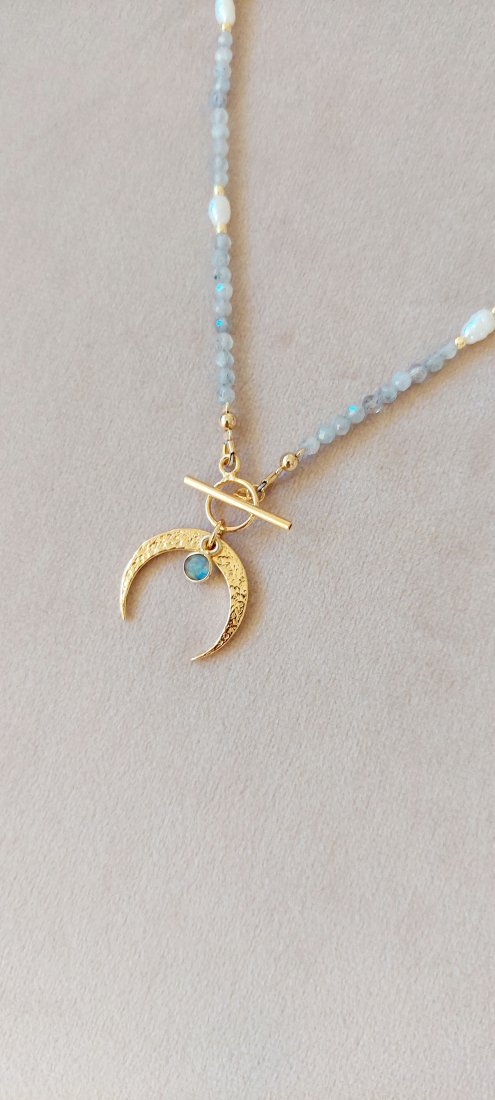 Lunula - ponadczasowy symbol kobiecości, otulona przez cudnie połyskujący labradoryt i nieregularne perły.