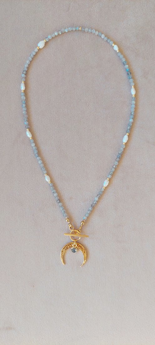Naszyjnik zapinany jest z przodu na zapięcie typu toggle, ozdobione zawieszką - lunulą, o średnicy 25 mm, oraz małą zawieszką z labradorytowym oczkiem. Zapięcie i zawieszki wykonane są ze srebra próby 925 pozłacanego 24-karatowym złotem. Naszyjnik ma długość 42 cm. Wielkość kamieni to 3 mm, perły mają wielkość 4-5 x 6-10 mm. Złote przekładki to wysokiej jakości szklane koraliki Toho.
