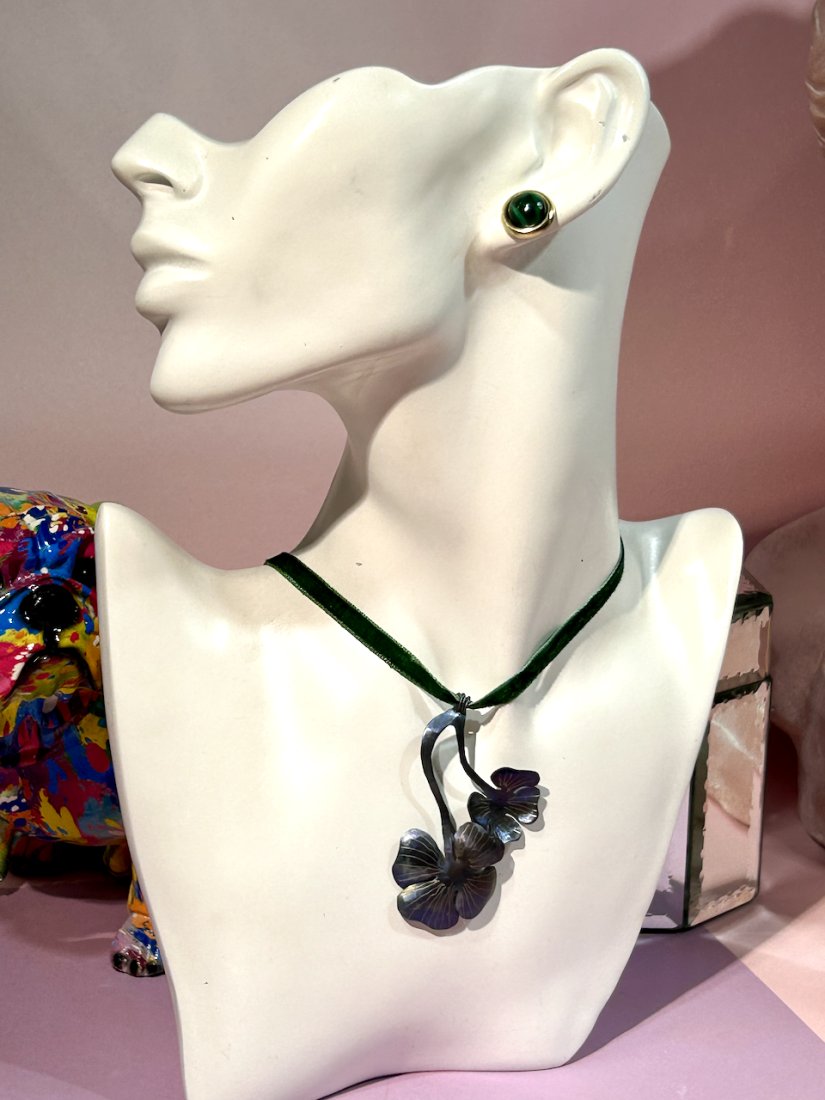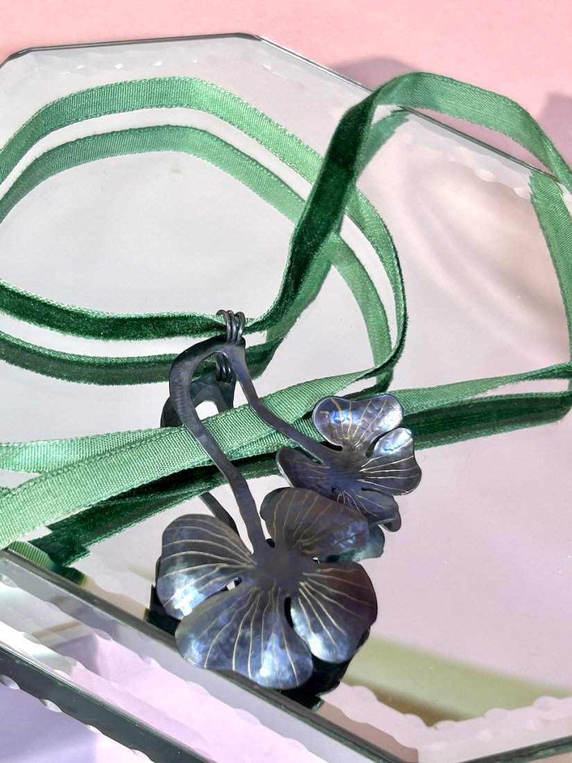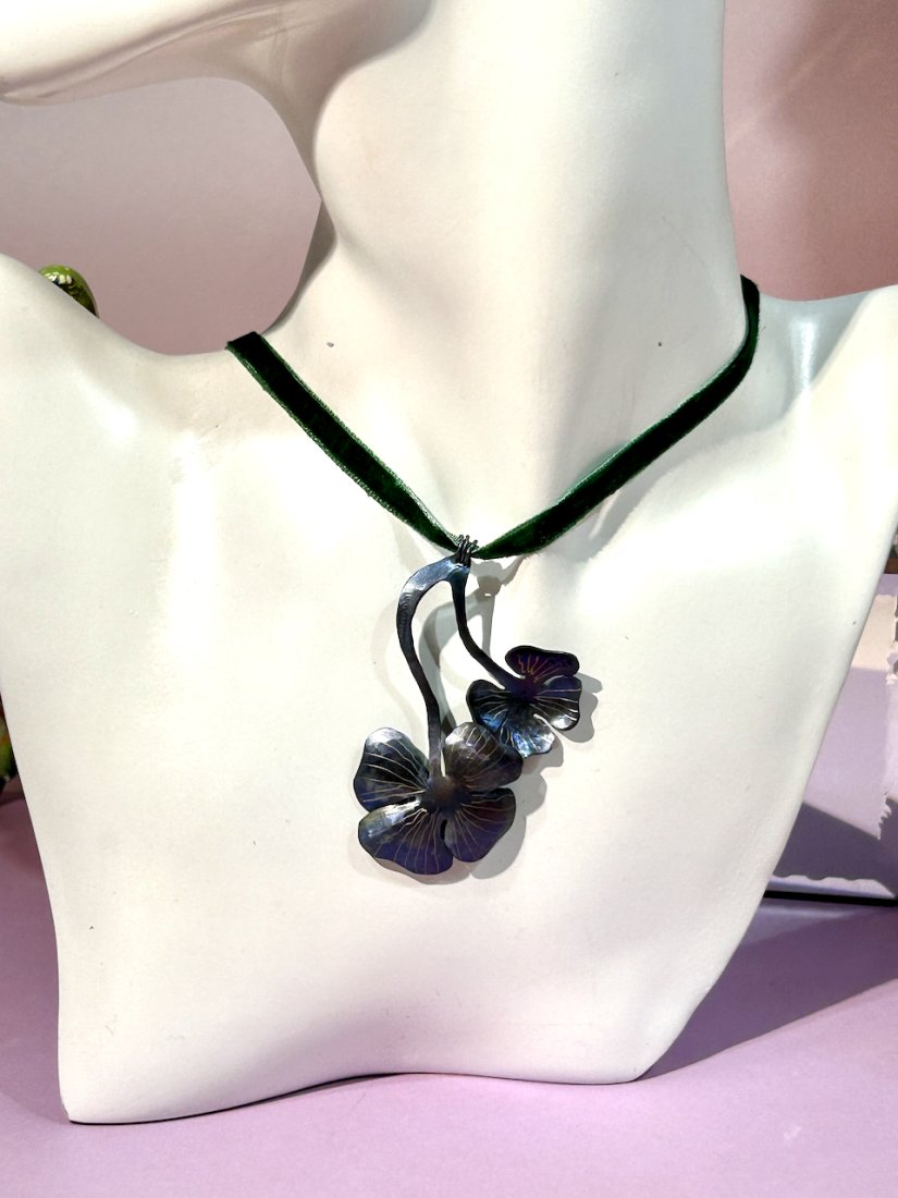 Zjawiskowy, ręcznie wykonany wisior z kobaltowo-błękitno-grafitowymi kwiatami.