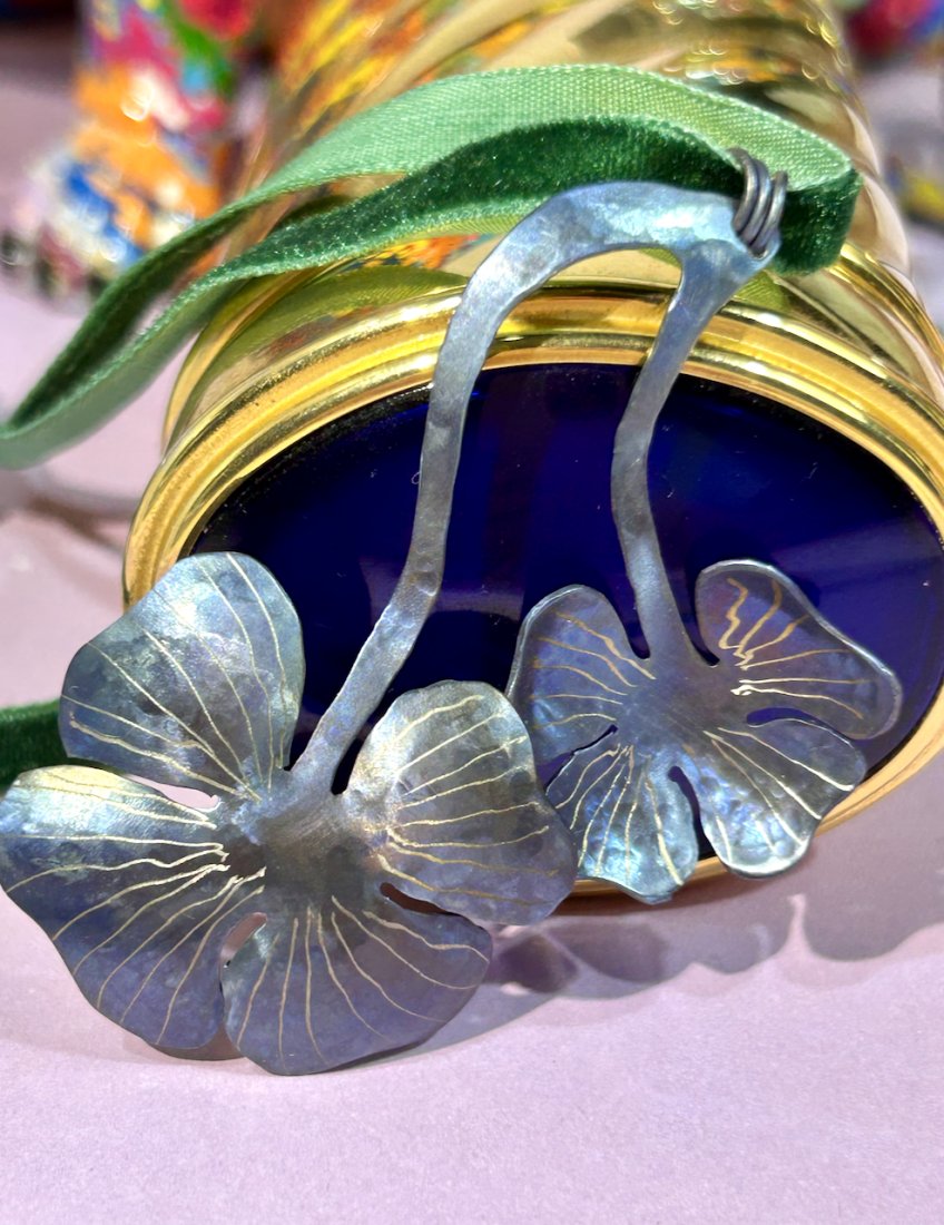 Ręcznie formowany, wycinany, mlotkowany i na koniec grawerowany ze srebra próby 0,925. Srebro tytanowe.