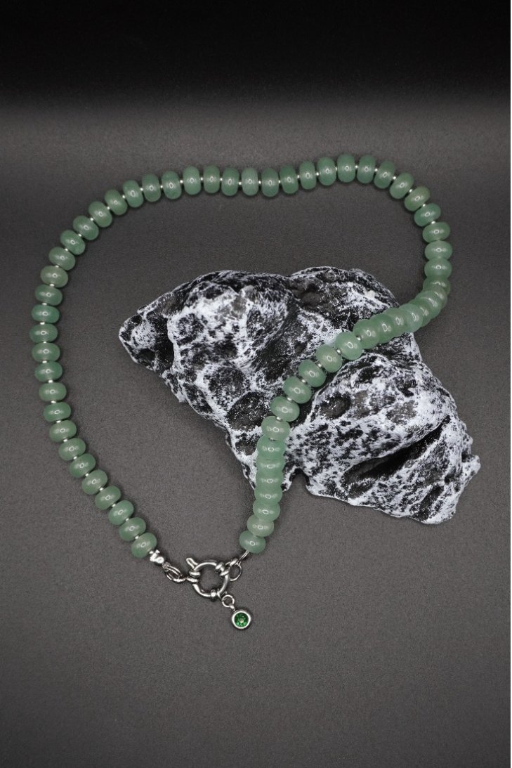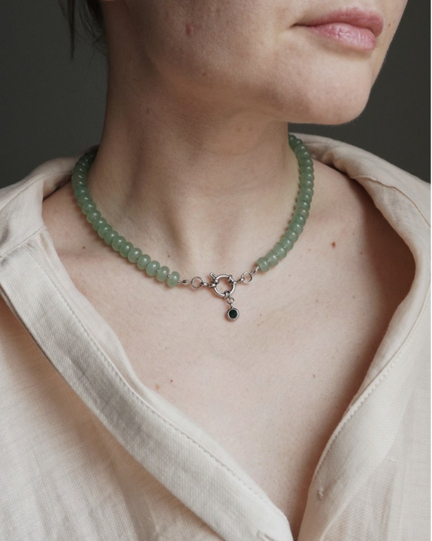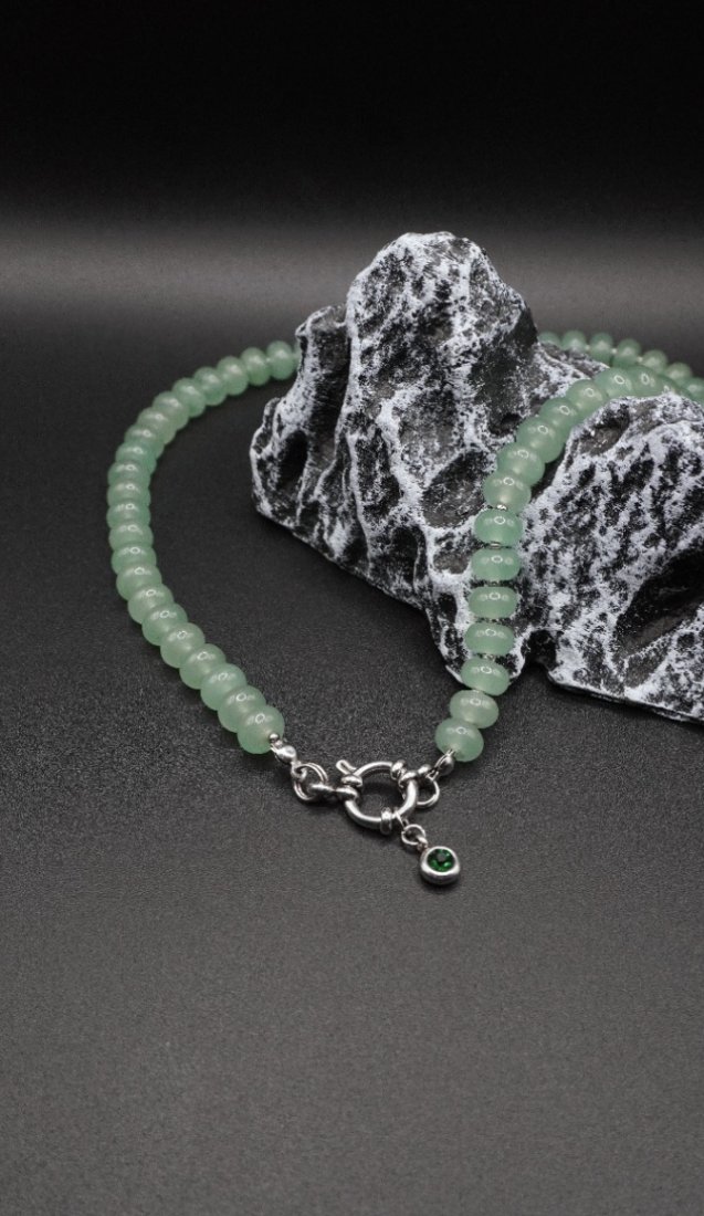 Elegancki naszyjnik–choker wykonany z naturalnego awenturynu w delikatnym, zielonym odcieniu. Gładkie, zaokrąglone koraliki pięknie układają się na linii szyi, tworząc subtelny akcent i podkreślając naturalne piękno stylizacji.