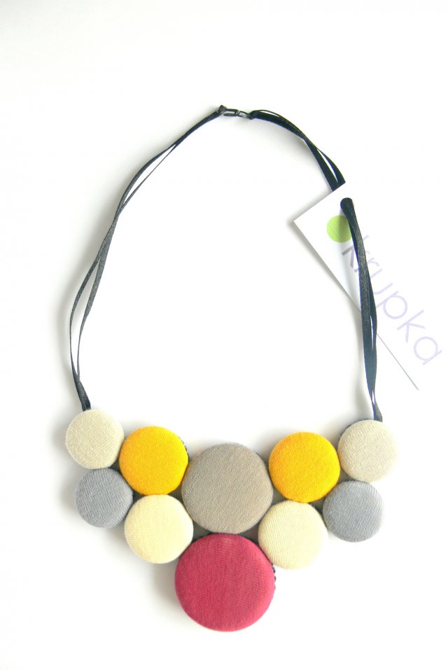 Wyjątkowy bawełniany naszyjnik wykonany w duchu upcyclingu. Upcycling zakłada wykorzystanie ponowne materiałów oraz przedmiotów i nadanie im drugiego życia. Do produkcji naszyjnika wykorzystałam ponownie materiały pochodzące z second-handów oraz niepotrzebne guziki :) Staram się, by każdy naszyjnik był wykonany z materiałów jak najlepszej jakości. Moje naszyjniki pięknie prezentują się w towarzystwie prostych ubrań, są kolorowe i ożywiają każdą kreację.