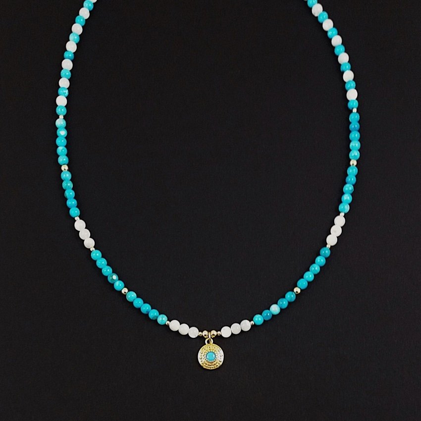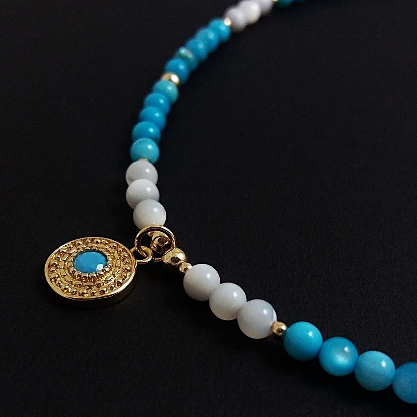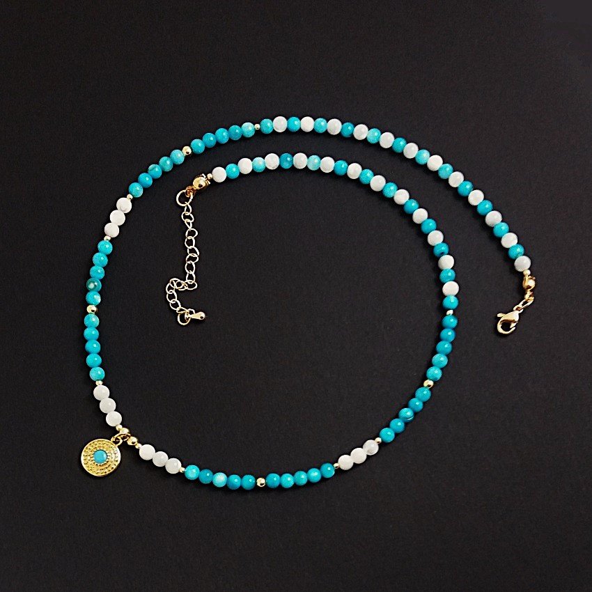 Lekki, delikatny naszyjnik z gładkich kulek masy perłowej, o średnicy 4mm, w białym i niebieskim kolorze. Zawieszka i wykończenie z pozłacanego mosiądzu ( nie uczula). Przekładki, małe kuleczki ze złotego hematytu. Elementy złote w ładnym jasnym odcieniu.