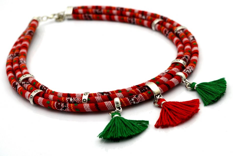 Naszyjnik ozdobiony został cynowymi przekładkami oraz ręcznie wykonanymi mulinowymi chwościkami.