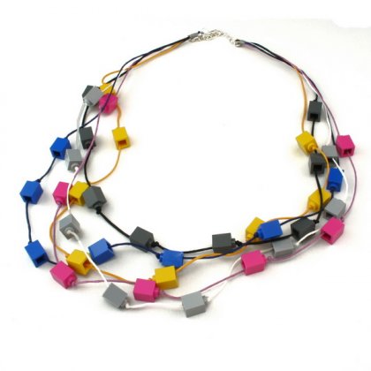 Naszyjnik BRUXELLES. Klocki LEGO® w żywych, niepospolitych kolorach w roli koralików. Długość naszyjnika ok.60cm plus łańcuszek przedłużający ok.5-7 cm. Wykonany z nowych klocków LEGO® i dobranego kolorystycznie delikatnego, woskowanego sznurka.