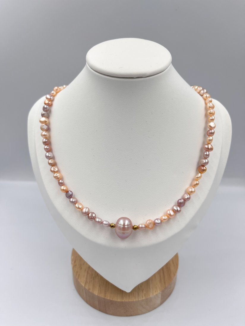 Przepiękny naszyjnik z pereł naturalnych - słodkowodnych. Perły mają niesamowicie oryginalny odcień brzoskwini. W samym centrum naszyjnika duża, brzoskwiniowa perła otoczona złotym hematytem.