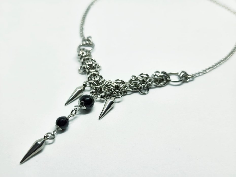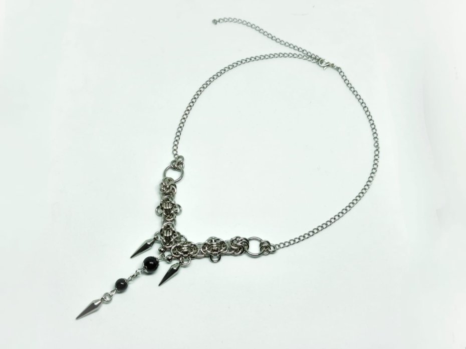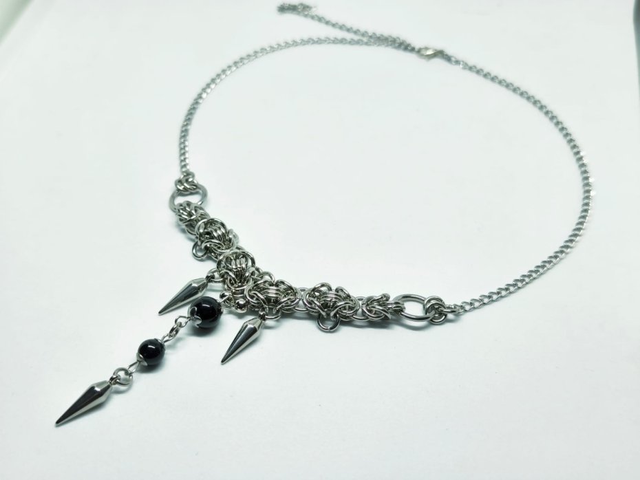 Mroczny, ciężki, totalnie unikatowy naszyjnik w stylu vampire / dark academia / witchy. Wykonany w 100% ręcznie techniką chainmaille (plecionka z kółeczek) + ostre kolce i czarne koraliki – wygląda jak z sesji fantasy albo klimatycznego koncertu metalowego.