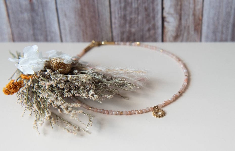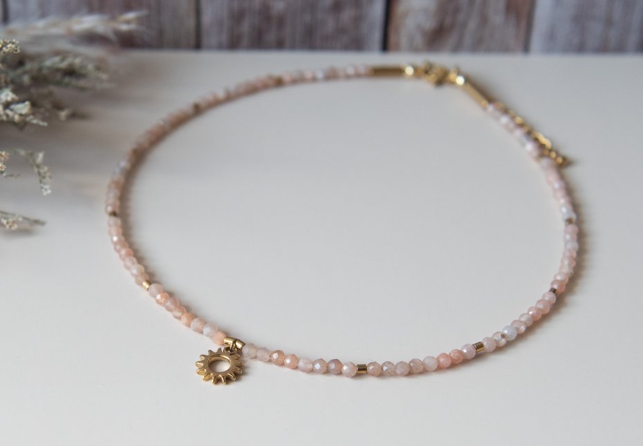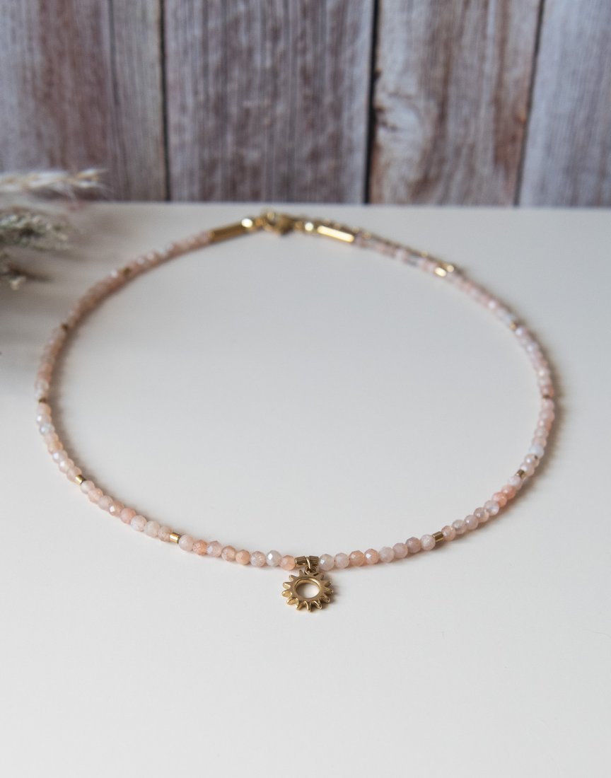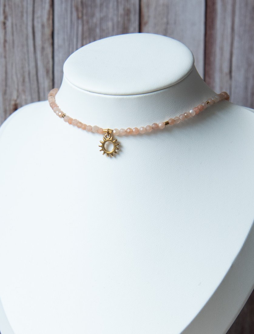 Ręcznie wykonany naszyjnik choker SUNSHINE z kamieni: kamień słoneczny (3 mm) i hematyt (3x2 mm) oraz z elementów ze stali nierdzewnej.