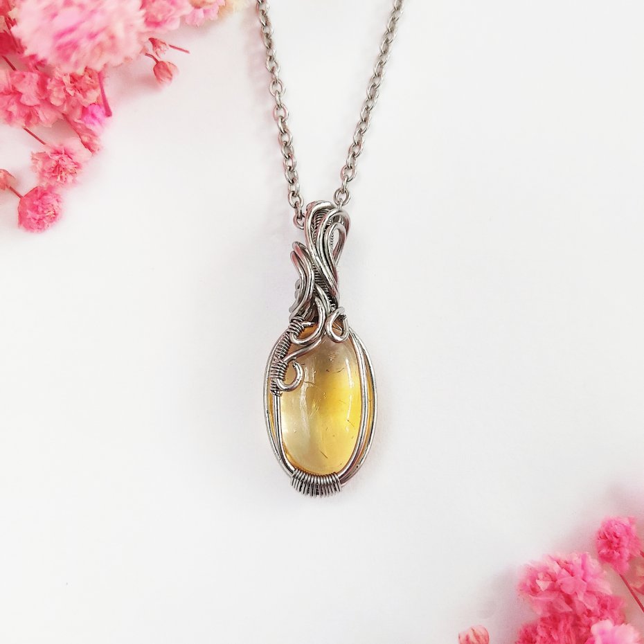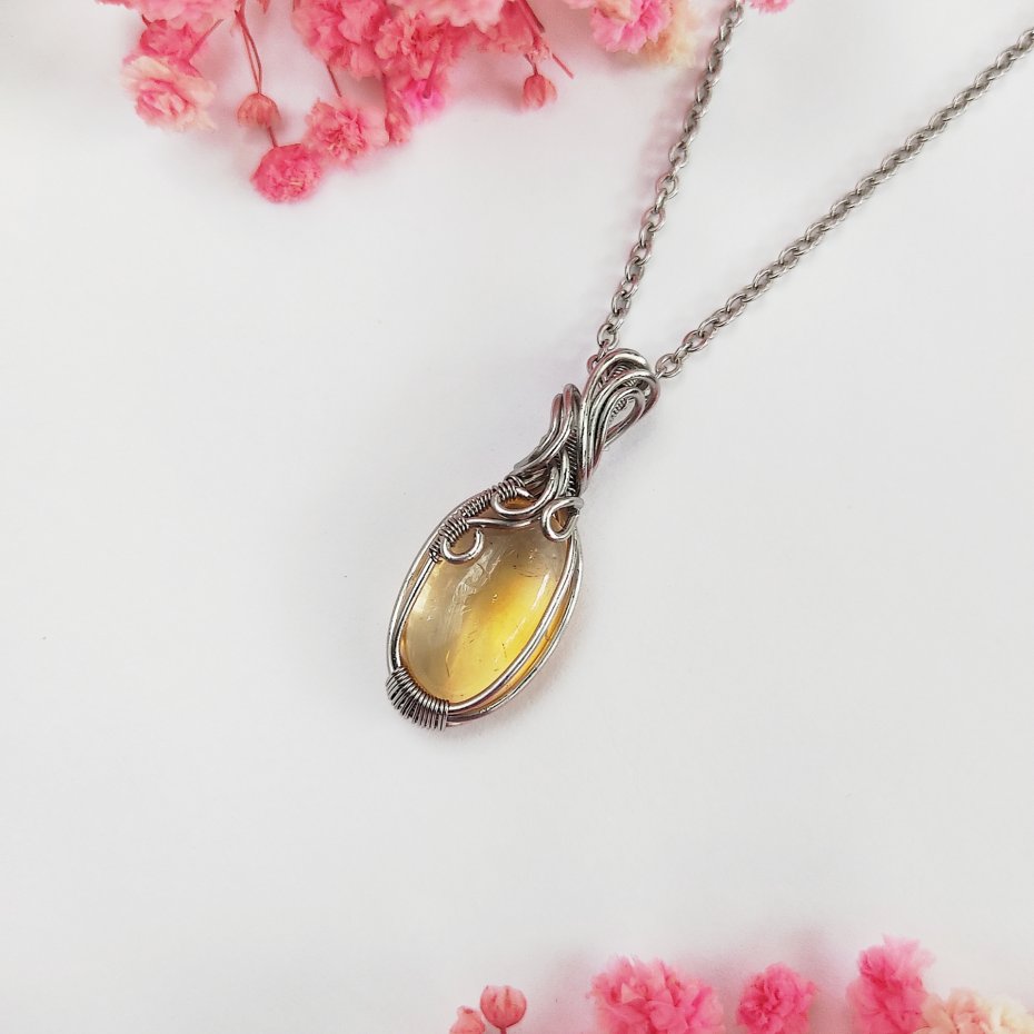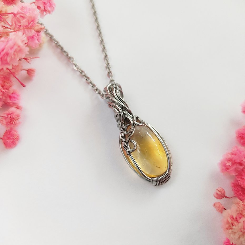 Naszyjnik Cytryn ręcznie wykonany z drutów ze stali chirurgicznej metodą wire wrapping.