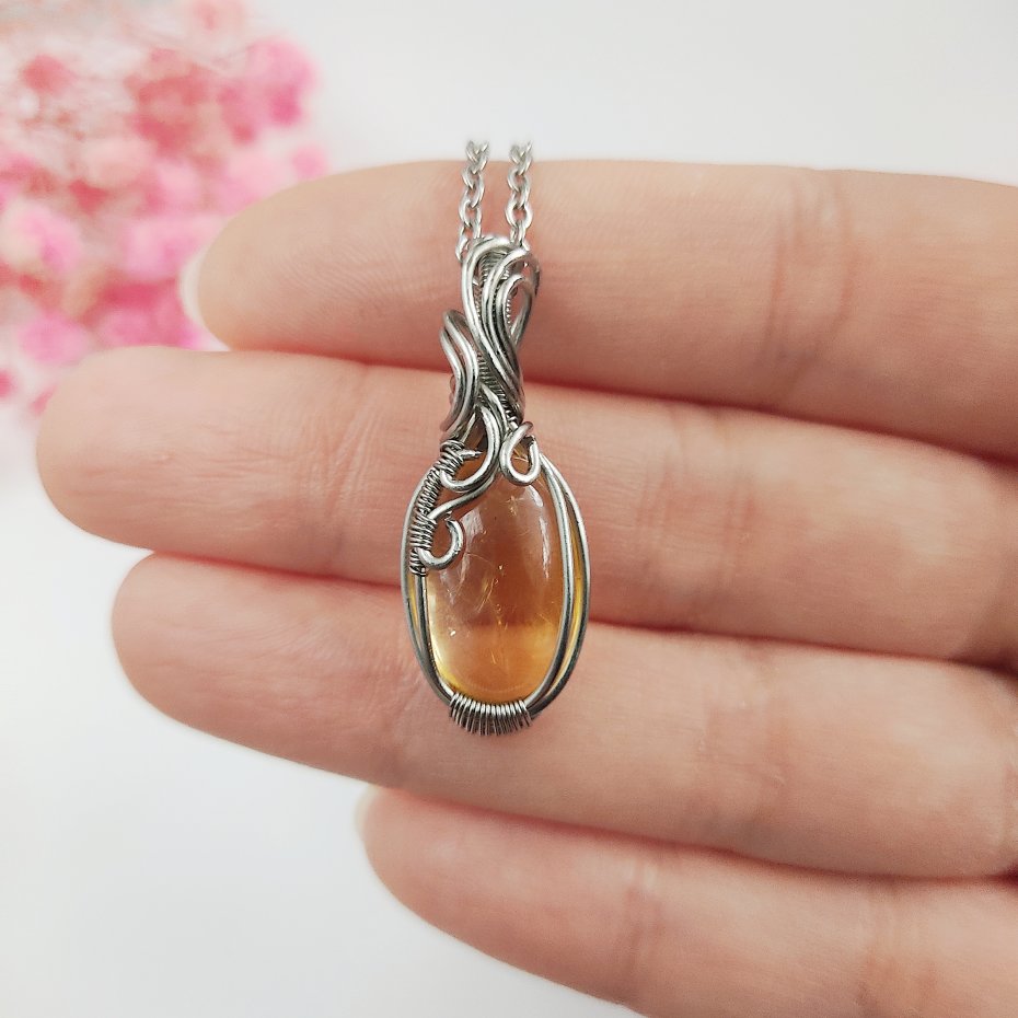 Stal chirurgiczna została użyta ze względu na swoje hipoalergiczne właściwości oraz odporność na zarysowania i korozję. Dzięki temu naszyjnik jest trwały, wygodny w noszeniu i odpowiedni także dla osób z wrażliwą skórą. Technika wire wrapping zastosowana przy tworzeniu tego modelu pozwoliła na ręczne oplecenie kamienia bez użycia kleju czy lutowania. Każdy egzemplarz jest dzięki temu unikalny i dopracowany z ogromną starannością, a cytryn został osadzony w sposób, który podkreśla jego naturalny blask.