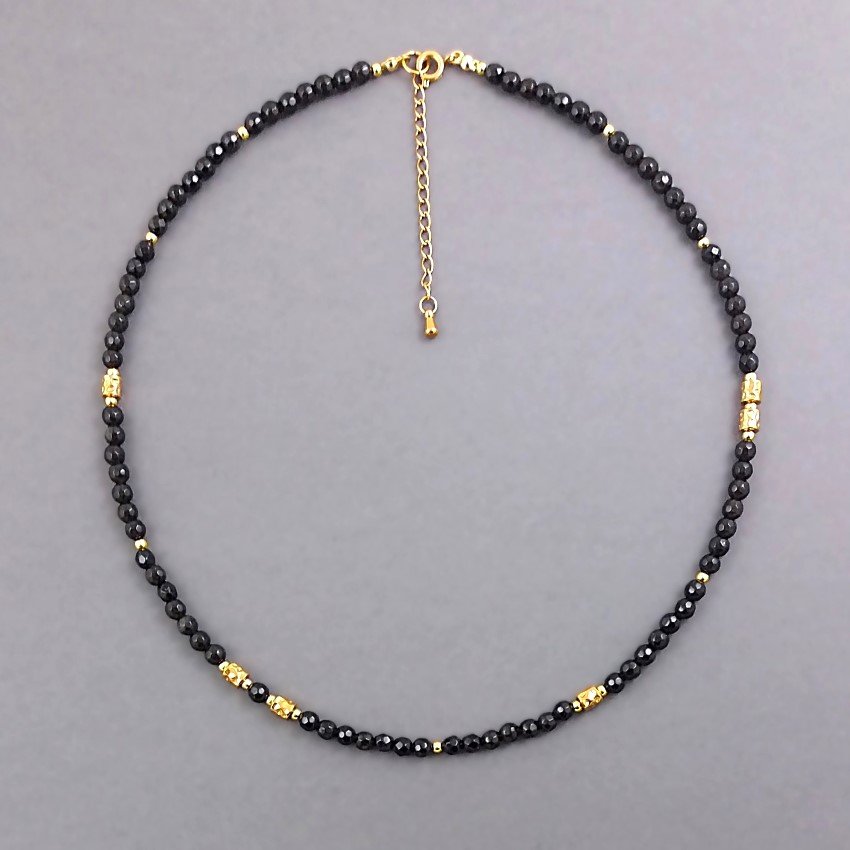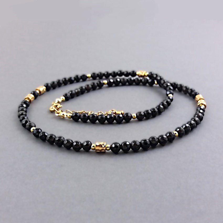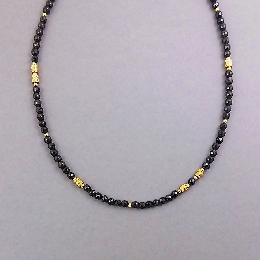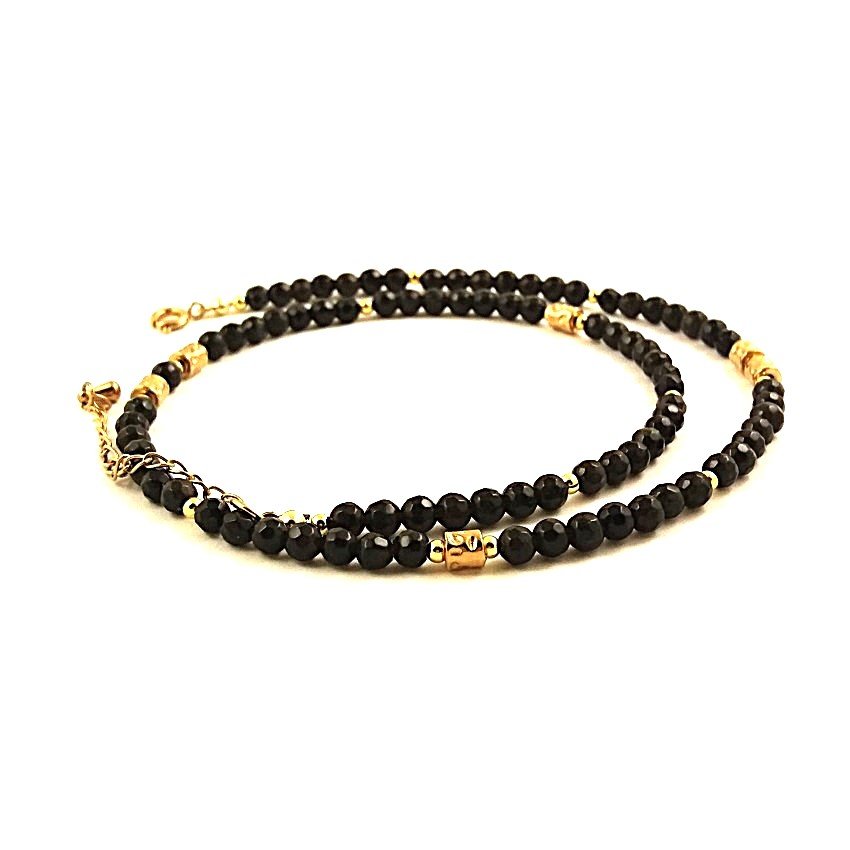 Elegancki, krótki naszyjnik z fasetowanych kulek czarnych onyksów, kuleczek ze złotych hematytów i "gniecionych'' walców z pozłacanej stali szlachetnej.
