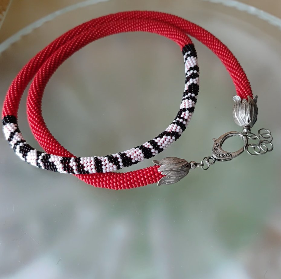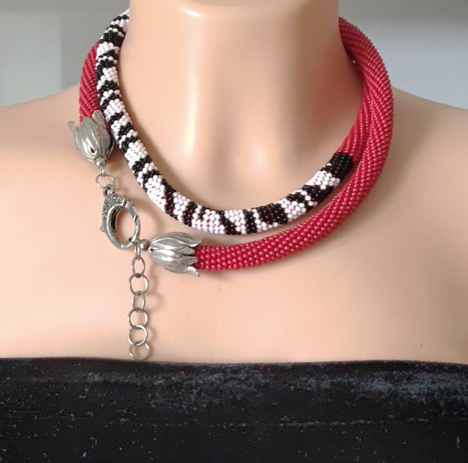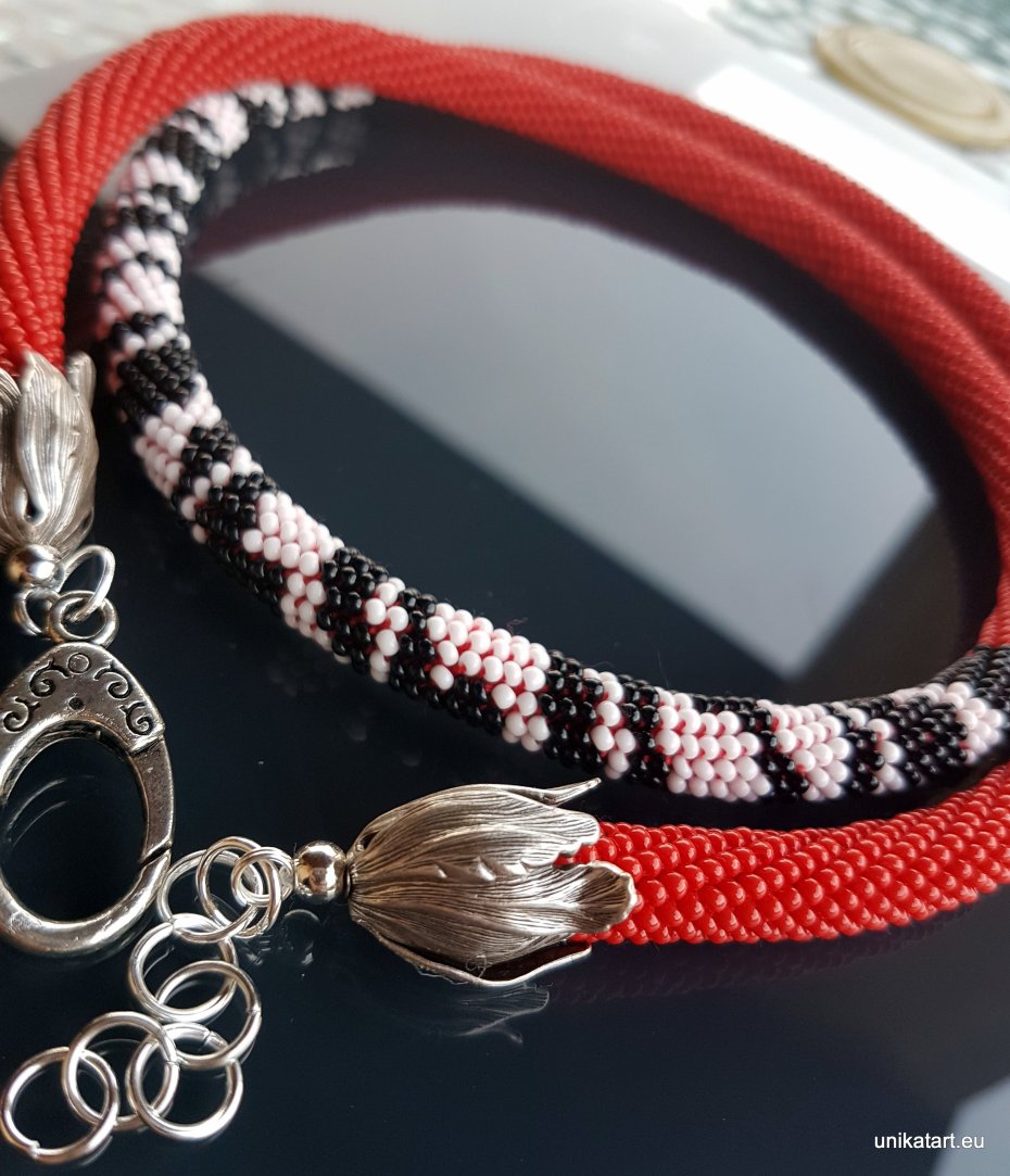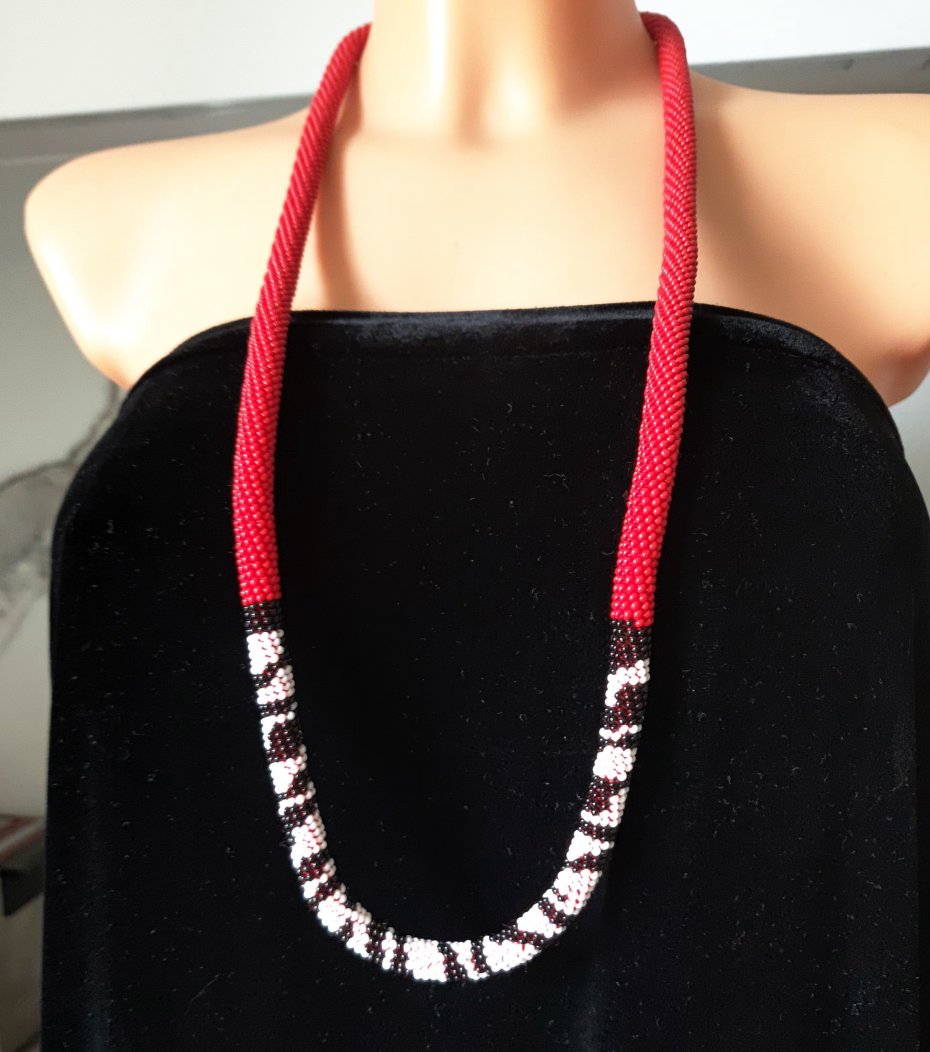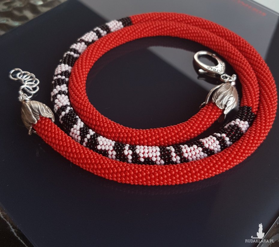 dwukrotnie owinięty wokół szyi stanowi krótki naszyjnik, a zapięcie jest jego ozdobą Dominujący czerwony kolor, szkło, metal,
