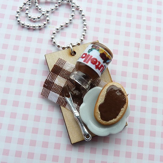 Oryginalny naszyjnik-miniaturowa deseczka, a na niej talerzyk, kromeczka chleba i słoiczek z kremem czekoladowym :) długość łańcuszka: 60cm, wymiary deseczki: 4x2,5cm. Wysyłam ozdobnie zapakowany;)